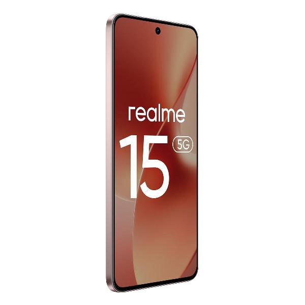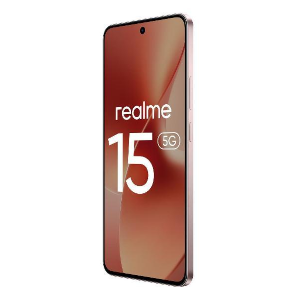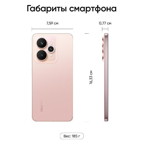 Смартфон realme RMX5106 15, цвет «розовый шелк» выполнен в ультратонком (7,66 мм) корпусе из пластика, защищенном от пыли и влаги по стандарту IP69. Премиальное матовое покрытие с прохладным ощущением стеклянной поверхности красиво переливается на свету. Дизайнерский акцент — индикаторное кольцо Pulse Light вокруг меньшего объектива камеры. На нижнем торце расположен слот для двух nano-Sim карт, которые поддерживают связь в сетях 2G, 3G, 4G LTE и 5G. Беспроводные технологии Wi-Fi 6, Bluetooth 5.4 и NFC отвечают за стабильное соединение, прием-передачу данных и бесконтактные платежи.