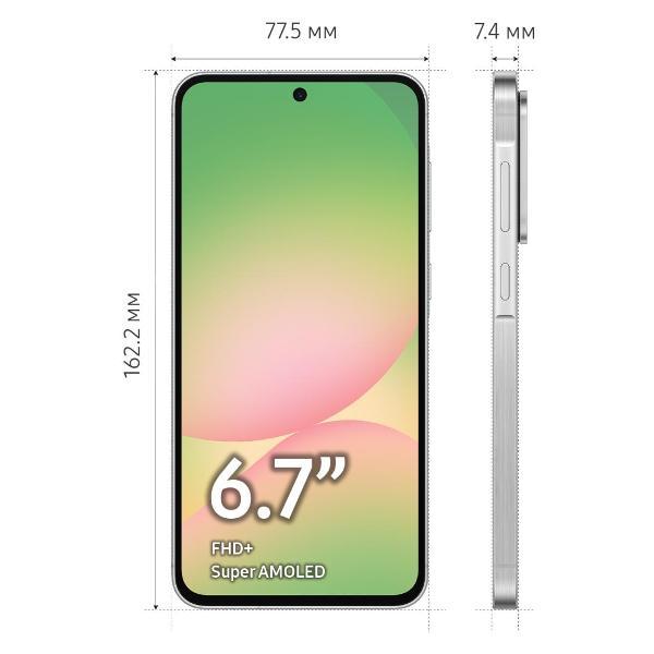 Смартфон Samsung A56 8/128Gb 5G Dual Sim awesome Light Gray — сбалансированное устройство с широким набором актуальных функций. 6,7-дюймовый экран разрешением 2340x1080 пикселей отображает картинку с высокой детализацией и обеспечивает комфортное чтение даже мелкого текста. Технология Super AMOLED гарантирует глубокий черный цвет и насыщенные оттенки. Пиковая яркость 1200 нит позволяет комфортно пользоваться смартфоном при солнечном свете. Прочное стекло Corning Gorilla Glass Victus повышает устойчивость экрана к царапинам и случайным повреждениям.