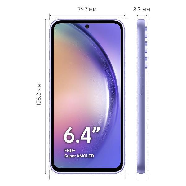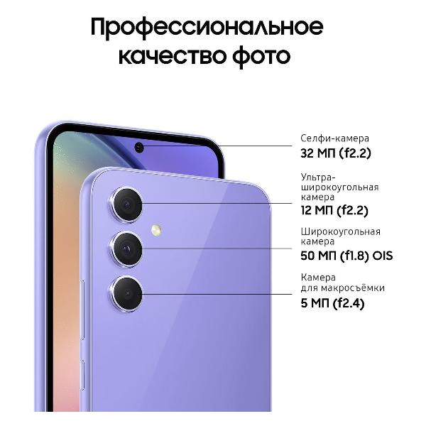 Смартфон Samsung Galaxy A54, лаванда обладает большим экраном диагональю 6,4 дюйма разрешением 2340х1080 пикселей, на котором комфортно играть, смотреть фильмы и видеоролики, общаться в социальных сетях, решать рабочие задачи. Технология Super AMOLED обеспечивает высокую яркость и контрастность, даже при ярком солнце картинка будет различима. Частота обновления 120 Гц способствует плавности отображения любого динамичного контента. Экран покрывает прочное стекло Corning Gorilla Glass.