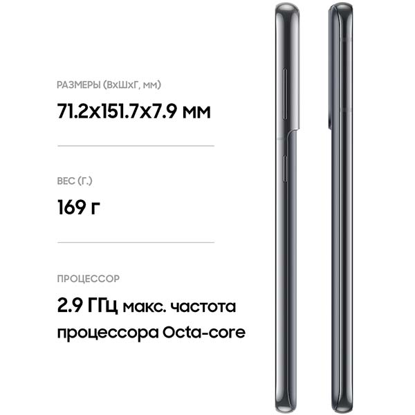 "Конкурс Samsung Galaxy".Одним из самых желанных приобретений в 2021 году для меня стал Samsung Galaxy S21. Мне больше по душе пришелся смартфон в классическом черном цвете, поэтому взял его. В комплекте идет USB - Type C, и скрепка для открывания лотка сим . Зарядного устройства в комплекте не предусмотрено. Новый дизайн мне очень понравился. Сзади расположился блок камер, который плавно переходит в боковую рамку. Подкупает то что рамка сделана из алюминия. Смотрится брутально и стильно. Телефон может работать в 5G сетях, еще одна дань прогрессу. Экран у телефона с диагональю 6,2 дюйма, разрешение FULL HD+, соотношение сторон 20:9, плотность пикселей 421 точек на дюйм. На смартфоне установлено защитное стекло нового поколения - Gorilla Glass Victus.То есть это самое прочное, самое дорогое стекло сейчас на рынке. Экран здесь защищен очень надежно. Сканер отпечатков пальцев находиться в правильном и удобном месте экрана, не надо тянуться вниз пальцем для разблокировки экрана. Сканер работает очень точно и быстро. Экран смартфона на 120 герц, это AMOLED дисплей. В телефоне можно настроить тайм-аут дисплея и плавность движения(Настройка частоты обновления экрана). Здесь на выбор адаптивная или стандартная. Адаптивная от 48 до 120 герц. Эта настройка будет автоматически регулировать частоту обновления экрана, в зависимости от приложения, где-то будет 48 герц,а где-то 120 ( это нужно для экономии заряда батареи). Экран сам очень удобный, работает все быстро, плавно , без задержек. Для глаз одно удовольствие! Все быстро открывается и ничего не лагает. Ведь еще бы здесь установлено самое флагманское железо. Смартфон работает на Android 11-ой версии, и оболочка One Ui здесь самая последняя 3.1.Само <<железо>> в телефоне очень мощное. Установлен процессор Exynos 2100, это очень производительный процессор. Здесь одно ядро очень мощное Cortex-X1(работает на частоте 2.9 Ггц),4 ядра энергоэффективных Cortex-A55,и 3 ядра Cortex-A78. Всего 8 ядер в сумме,5 нанометровый процесс