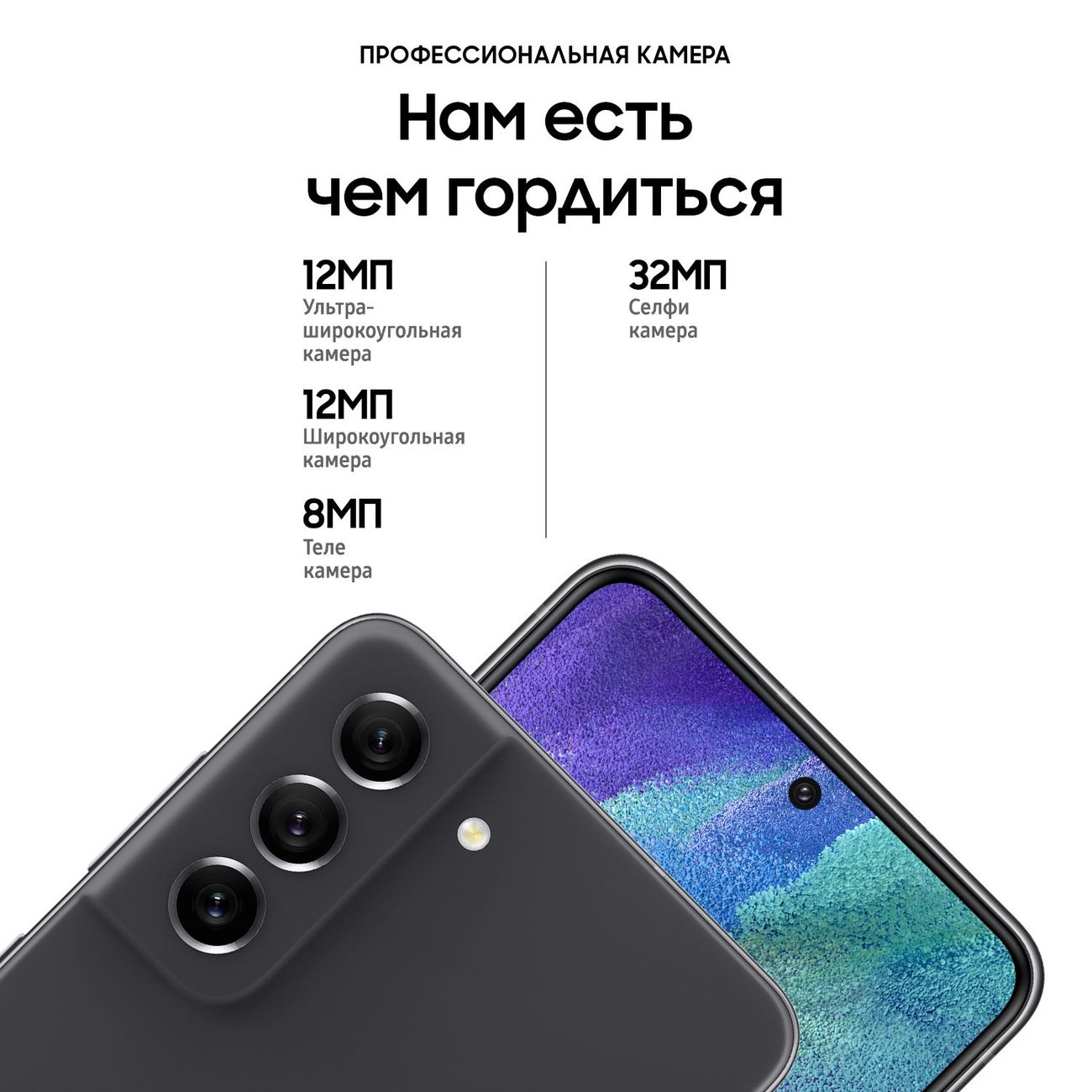 Смартфон Samsung Galaxy S21FE графитового цвета выполнен в корпусе из пластика и стекла, защищающем устройство от попадания влаги и пыли по стандарту IP68. Объем оперативной памяти — 6 Гб, объем встроенной памяти — 128 Гб. Смартфон поддерживает установку двух SIM-карт формата nanoSIM со стандартами LTE и 5G.