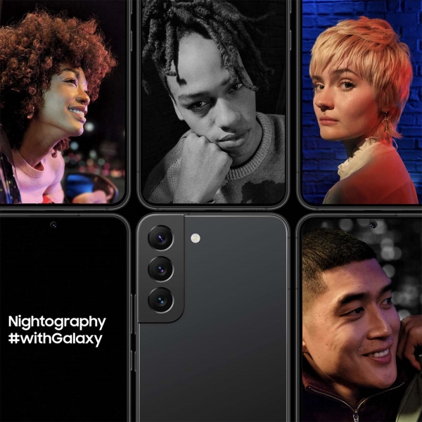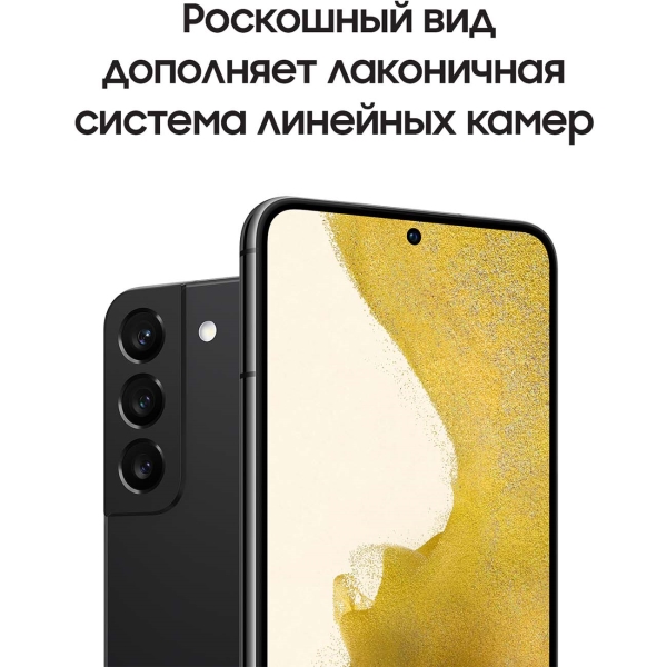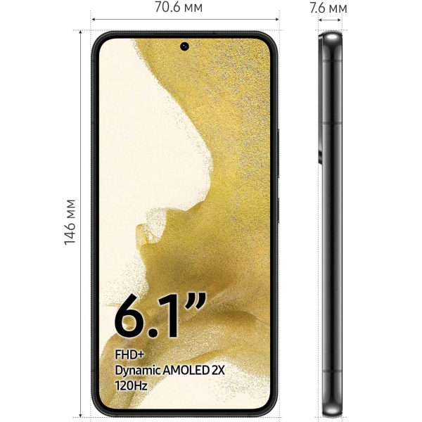 Смартфон Samsung Galaxy S22 (SM-S901E/DS) Black с оперативной памятью объемом 8 Гб и встроенной — 128 Гб обладает безрамочным сенсорным экраном диагональю 6,1 дюйма разрешением 1080x2340 пикселей, созданным с использованием технологии Dynamic AMOLED 2X. Частота обновления составляет 120 Гц, что исключает возможность искажения изображения в динамичных сценах. В основе работы лежит операционная система Android 12. За производительность отвечает восьмиядерный процессор от Qualcomm.