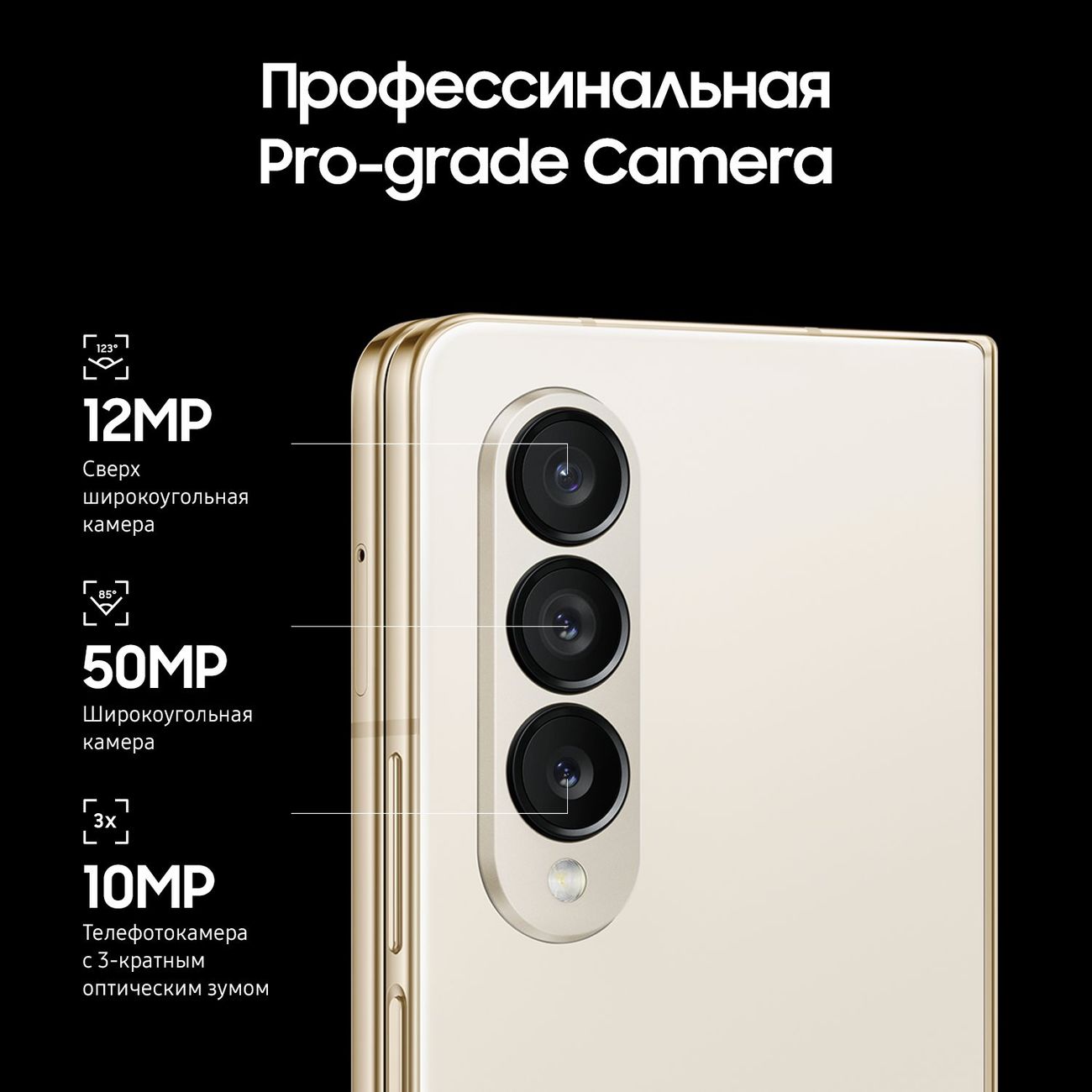 Смартфон Samsung Galaxy Z Fold 4 белого цвета выполнен в раскладном металлическом корпусе со стеклянной задней панелью и оснащен 512 Гб памяти для хранения данных. Объем оперативной памяти — 12 Гб. Корпус устройства защищен от попадания влаги и пыли по классу IPX8.
