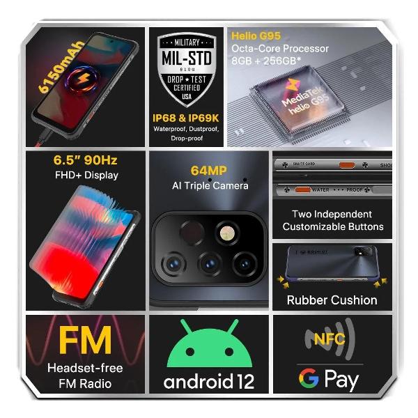 Смартфон представлен в ударопрочном, защищенном по стандарту IP68 корпусе из пластика, каучука и закаленного стекла. Габаритные размеры — 172,2х83,9х12,9 мм. Сенсорный мультитач IPS-экран диагональю 6,5 дюйма с частотой обновления 90 Гц обеспечивает плавный скроллинг, демонстрирует изображения разрешением 2400х1080 пикселей с яркостью до 600 нит. Микрофон и монодинамик с поддержкой басов способствуют качественной голосовой связи.