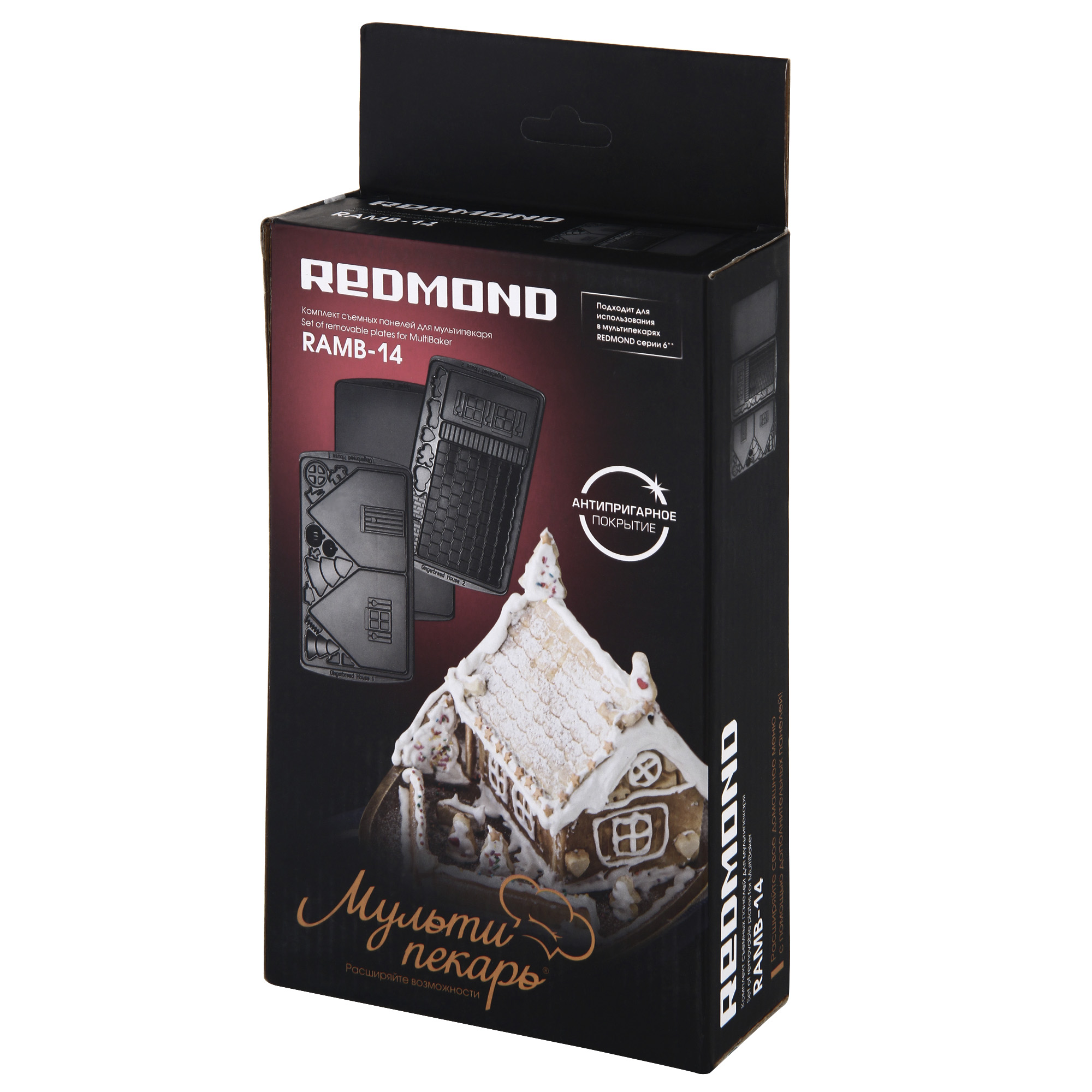 Redmond RAMB-14 – комплект сменных панелей, предназначенных для использования с мультипекарем Redmond. Они легко устанавливаются в устройство и позволяют создавать панели для пряничного домика, а также разнообразные украшения, благодаря которым съедобное «здание» будет выглядеть особенно привлекательно. С их помощью можно с минимальными затратами времени получить оригинальный десерт для детского праздника или семейного торжества.