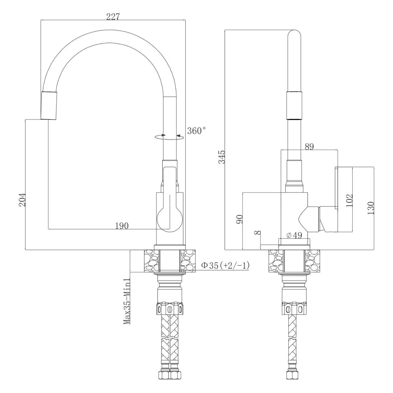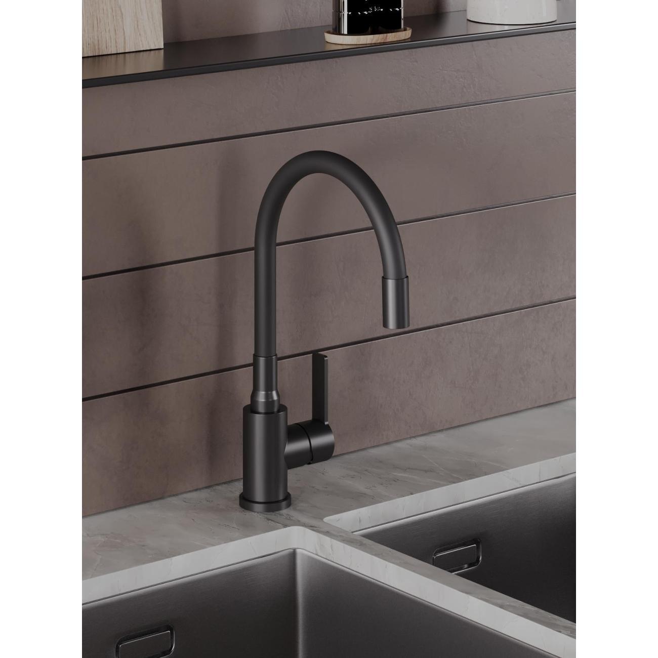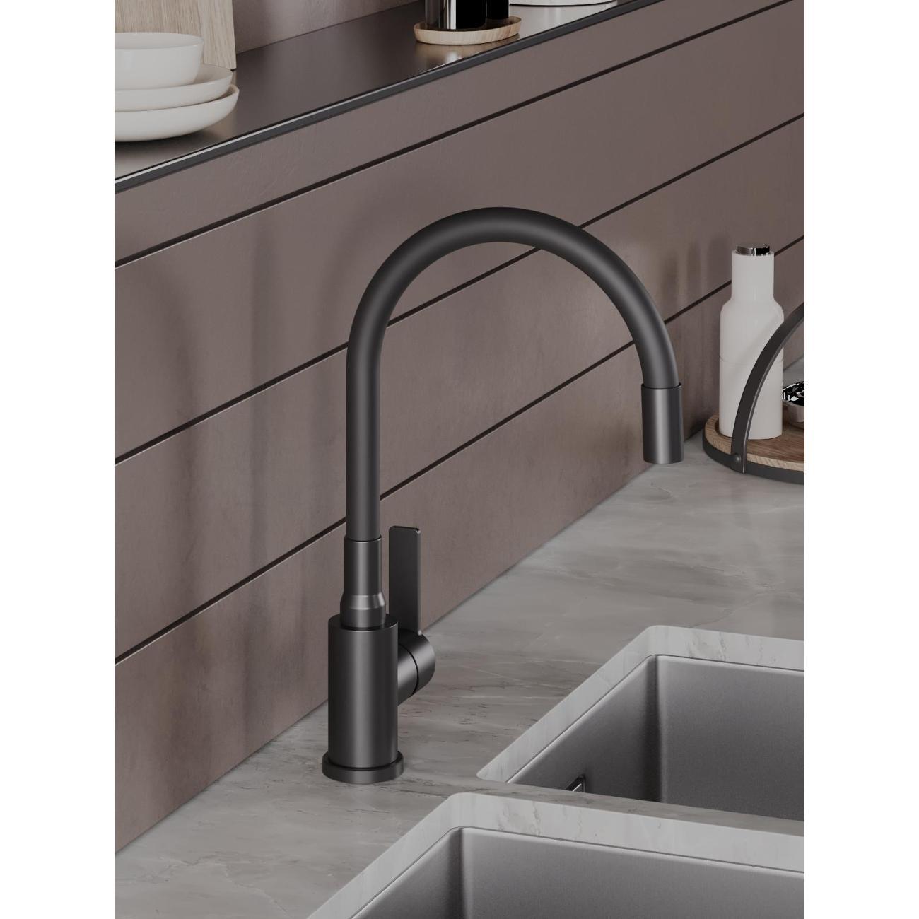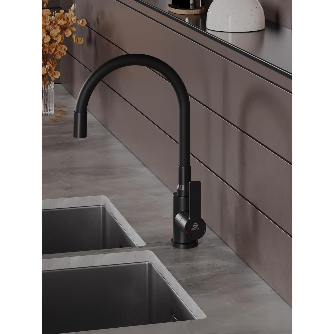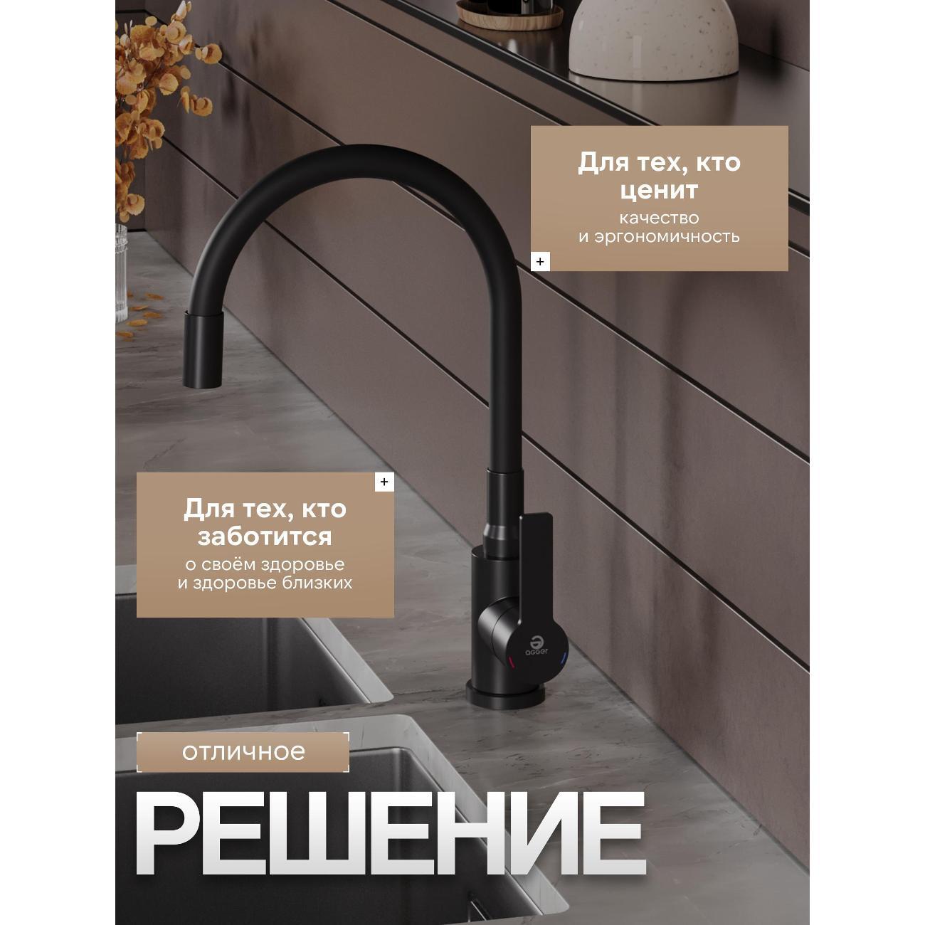 Однозахватный смеситель для кухни с поворотным гибким изливом Agger Easy гармонично дополнит интерьер Вашей кухни в современном или традиционном стиле. Фирменный керамический картридж Agger и эргономичный рычаг делают легким управление напором и температурой воды. Корпус изделия изготовлен из высококачественной нержавеющей стали, не подверженной коррозии от длительного контакта с водой. Покрытие в цвете матовый черный, за которым просто ухаживать мягкой салфеткой, нанесено методом порошковой окраски с многоступенчатой системой подготовки и высокотемпературной обработкой. Встроенный аэратор экономит воду и, обогащая струю воздухом, делает ее мягкой без брызг. Смеситель оснащен гибким изливом, что упростит мытье посуды и гигиеническую уборку мойки. В комплекте гибкая подводка (600 мм). Стандарт подводки - 1/2. Гарантия 5 лет.