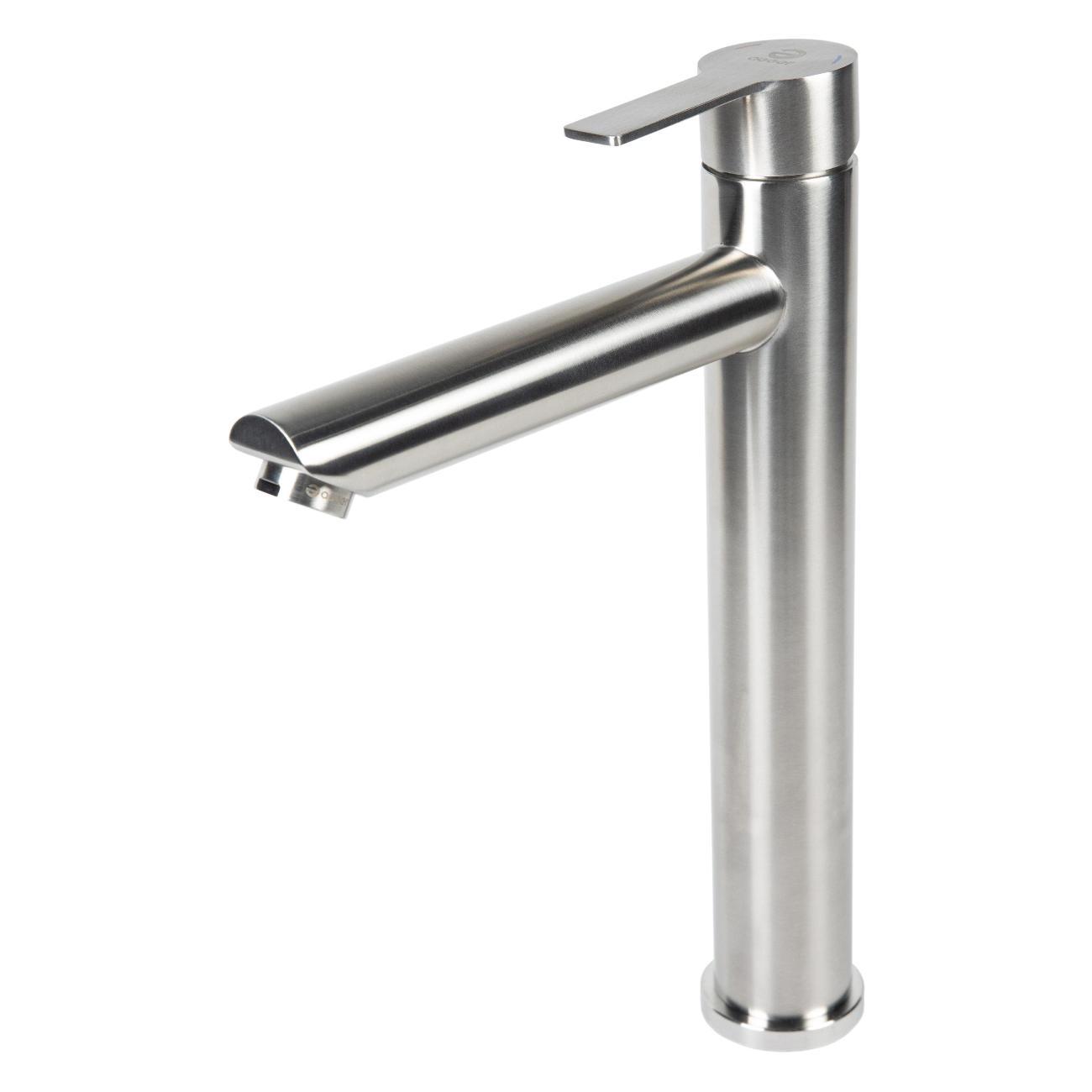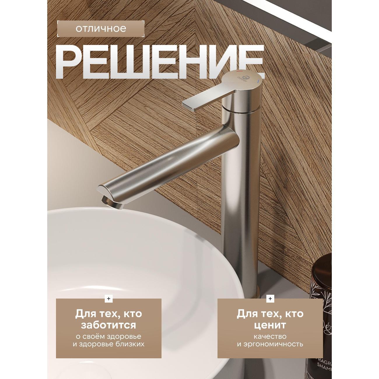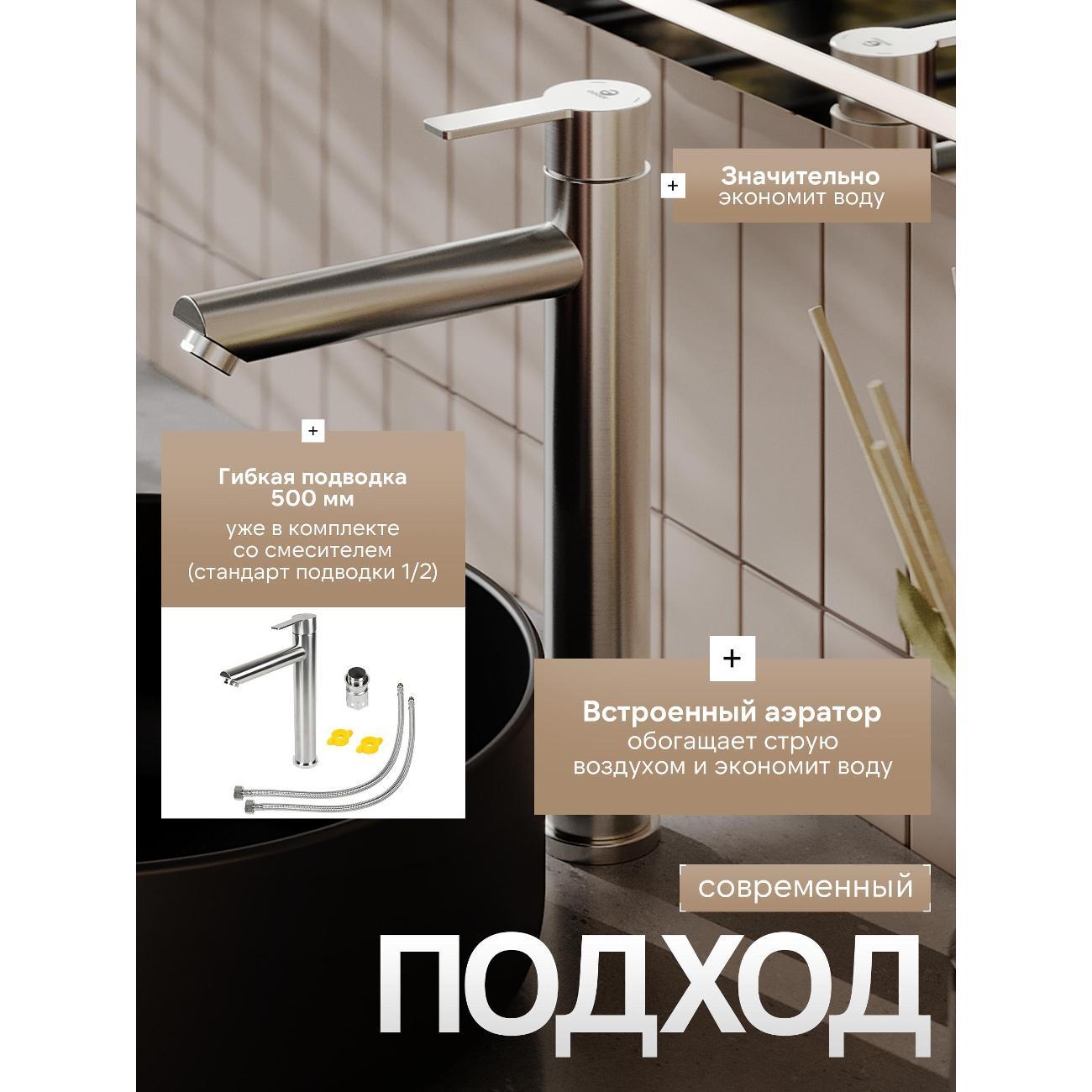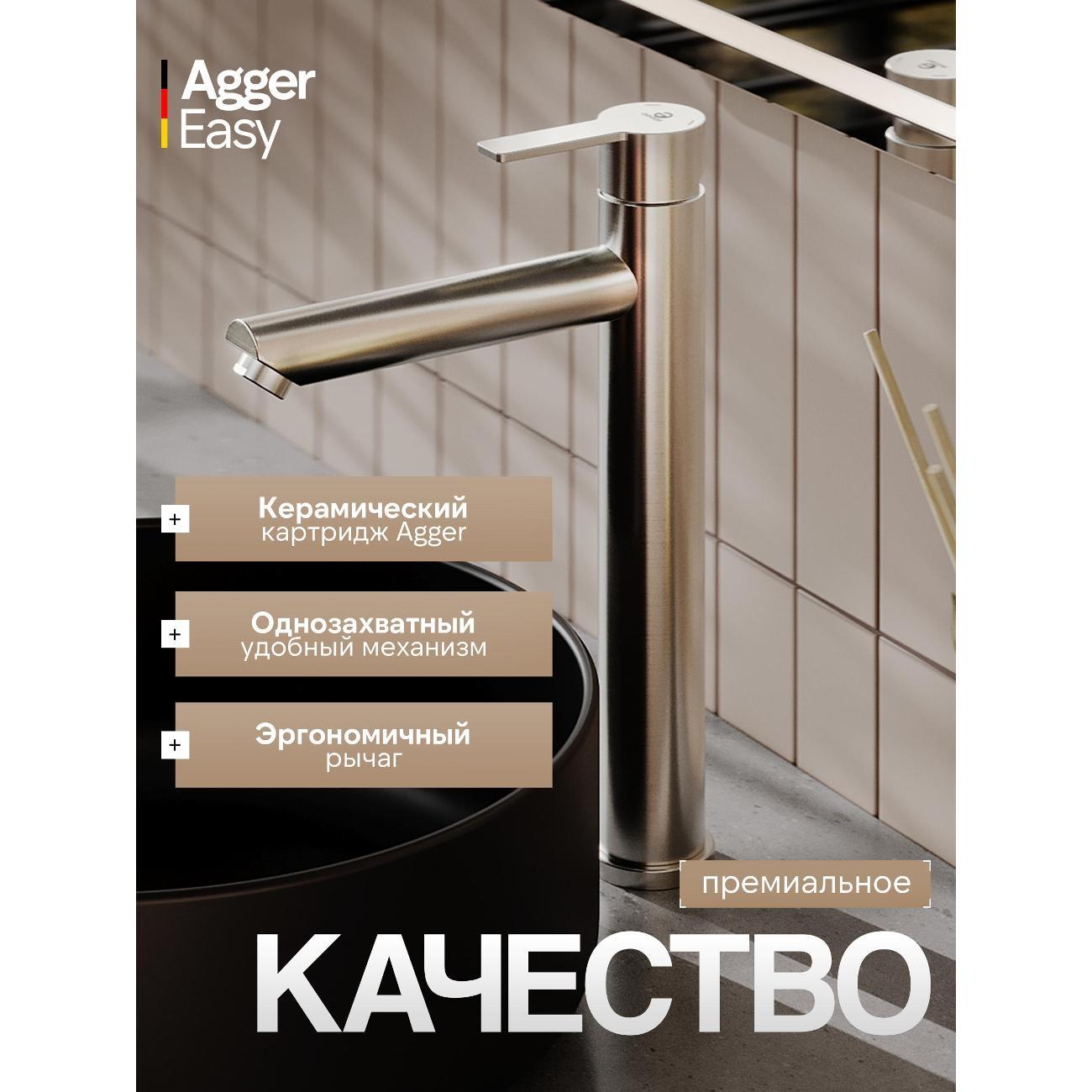 Однозахватный высокий смеситель для накладной раковины Agger Easy с фиксированным изливом гармонично дополнит интерьер ванной комнаты в современном или традиционном стиле. Фирменный керамический картридж Agger и эргономичный рычаг делают легким управление напором и температурой воды. Корпус изделия изготовлен из высококачественной нержавеющей стали, не подверженной коррозии от длительного контакта с водой. Износостойкое покрытие в цвете матовый сатин, за которым очень просто ухаживать мягкой салфеткой, нанесено методом вакуумного напыления. Встроенный аэратор экономит воду и, обогащая струю воздухом, делает ее мягкой без брызг. Гибкая подводка 50 см.