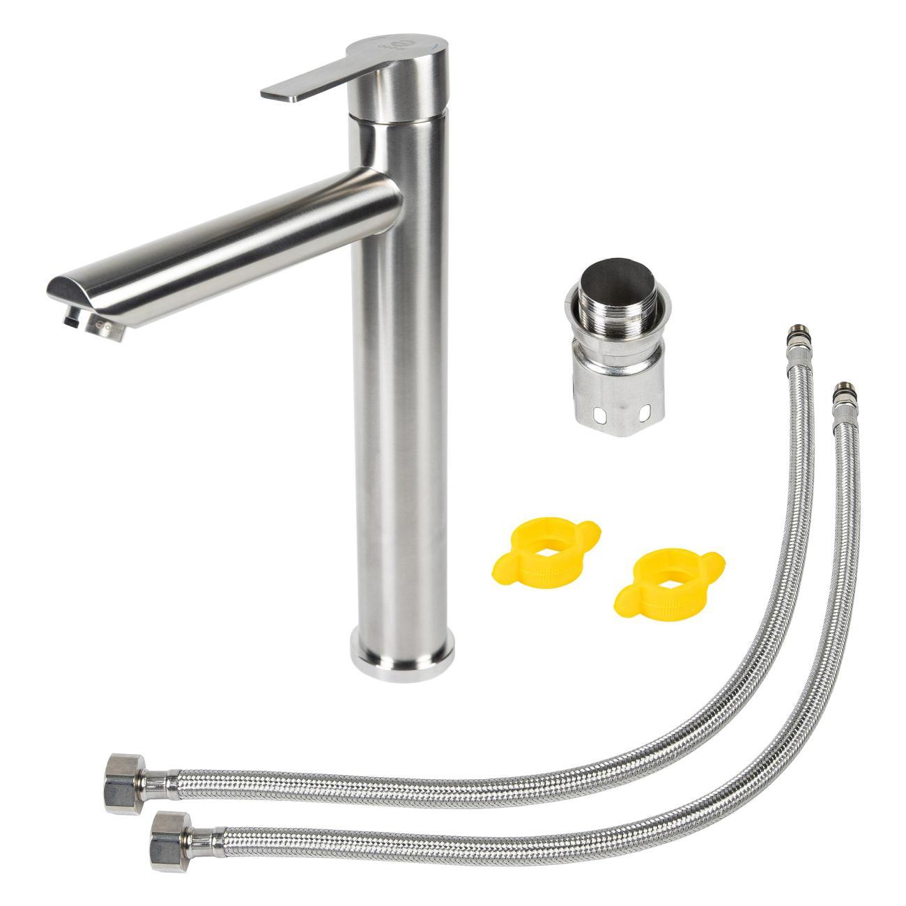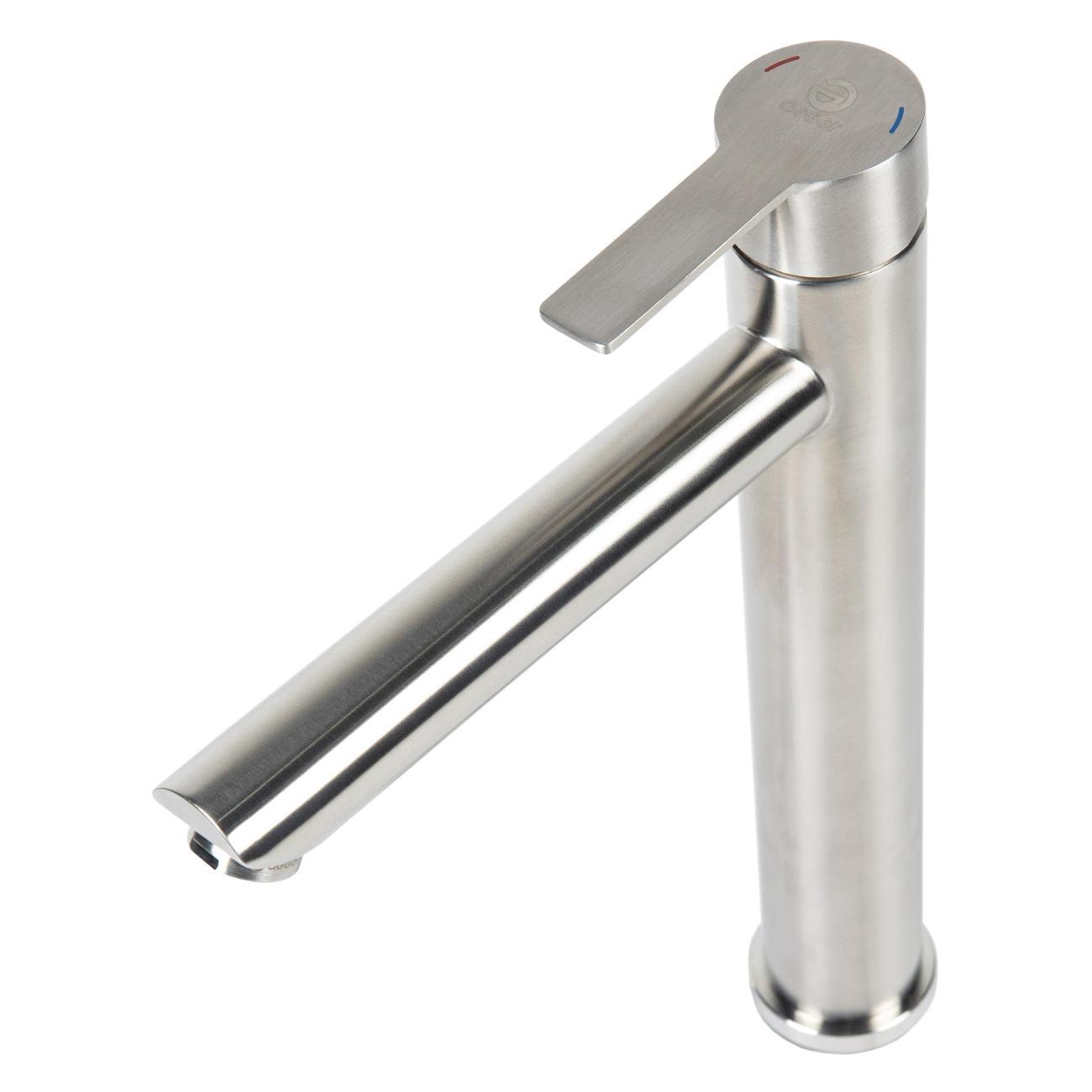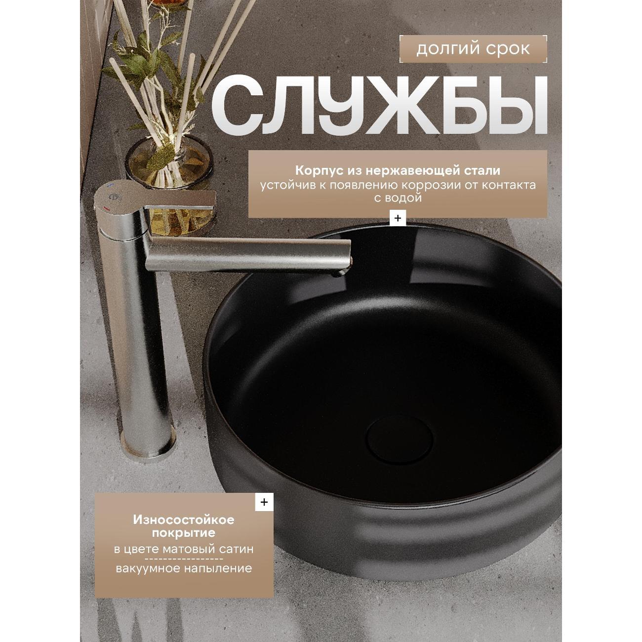 Однозахватный высокий смеситель для накладной раковины Agger Easy с фиксированным изливом гармонично дополнит интерьер ванной комнаты в современном или традиционном стиле. Фирменный керамический картридж Agger и эргономичный рычаг делают легким управление напором и температурой воды. Корпус изделия изготовлен из высококачественной нержавеющей стали, не подверженной коррозии от длительного контакта с водой. Износостойкое покрытие в цвете матовый сатин, за которым очень просто ухаживать мягкой салфеткой, нанесено методом вакуумного напыления. Встроенный аэратор экономит воду и, обогащая струю воздухом, делает ее мягкой без брызг. Гибкая подводка 50 см.