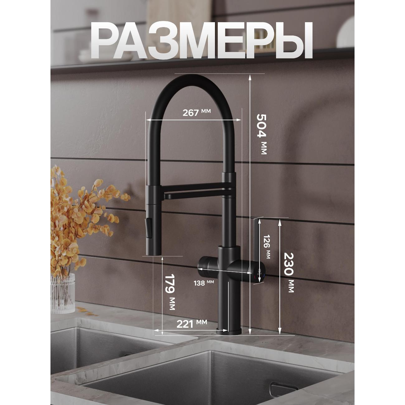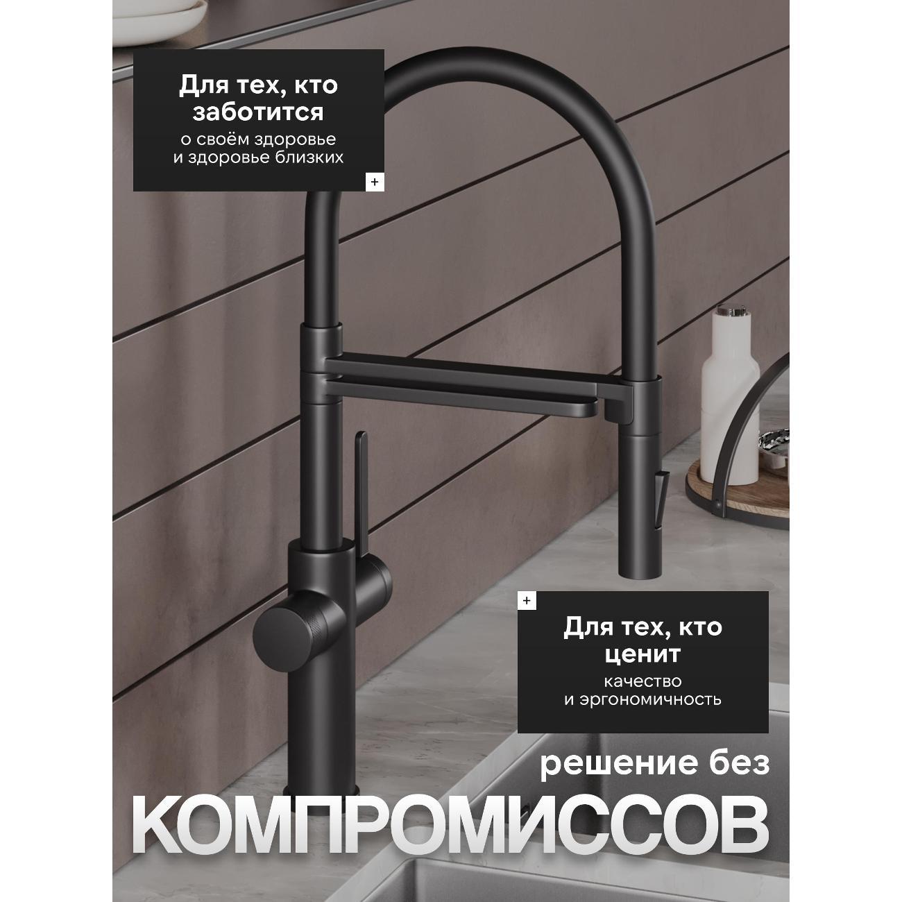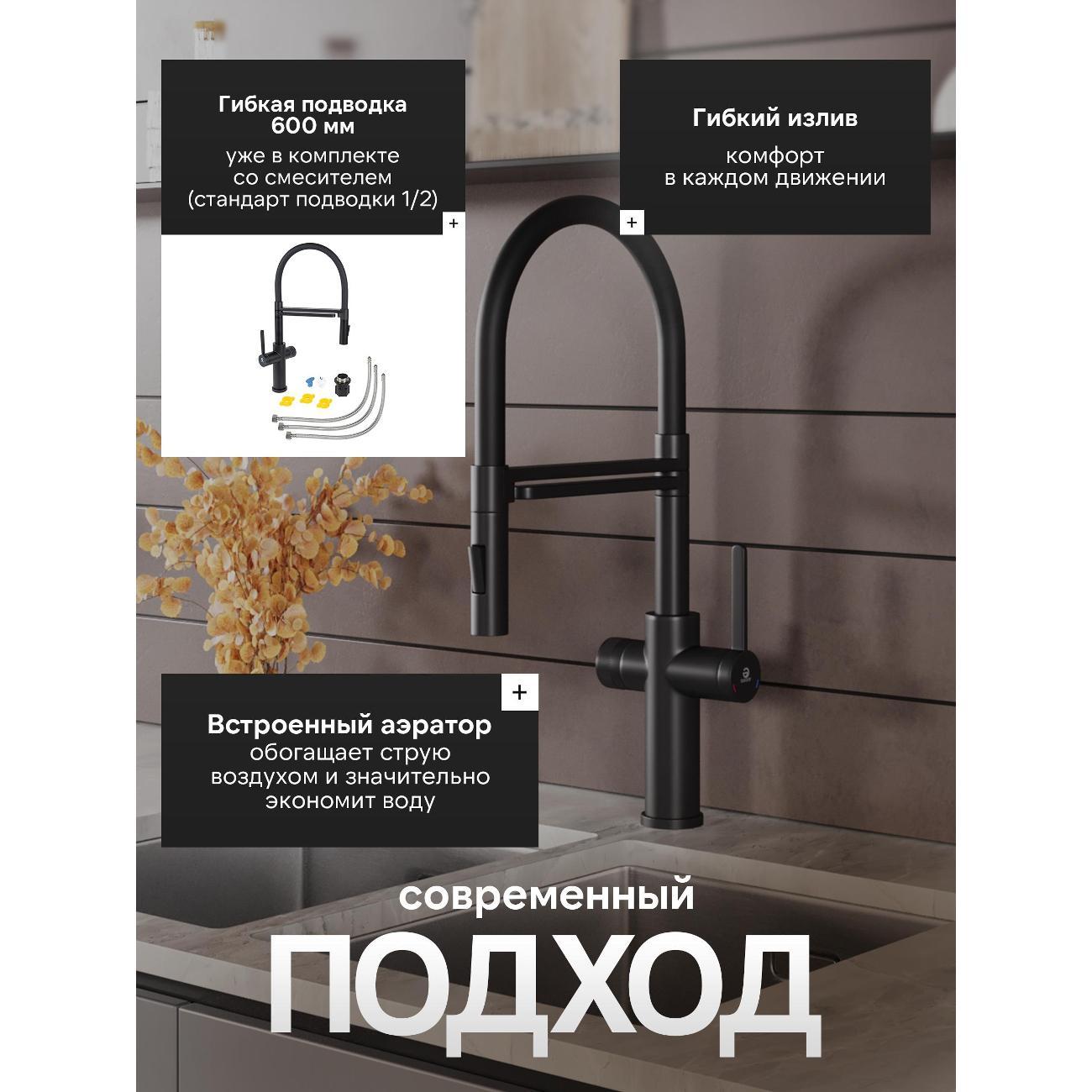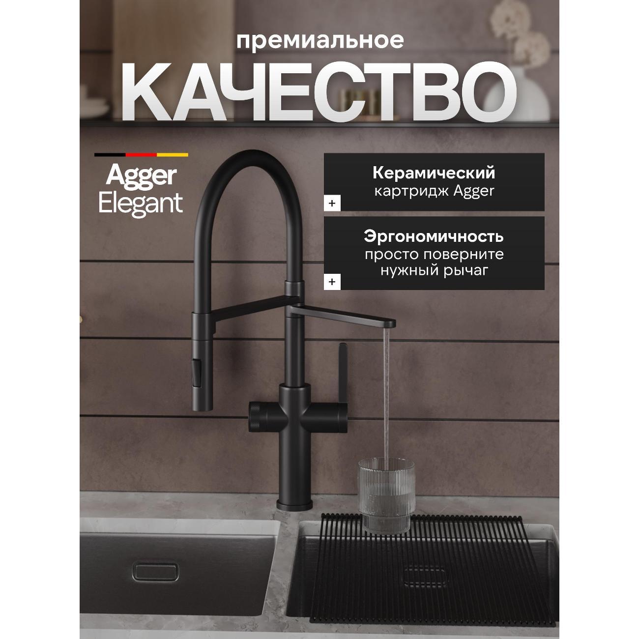 Однозахватный смеситель для кухни с гибким поворотным изливом Agger Elegant с возможностью подключения фильтра – эргономичное решение для тех, кто заботится о своем здоровье и здоровье близких. Фирменный керамический картридж Agger и эргономичный рычаг делают легким управление напором и температурой воды. Корпус изделия изготовлен из высококачественной нержавеющей стали, не подверженной коррозии от длительного контакта с водой. Покрытие в цвете матовый черный, за которым просто ухаживать мягкой салфеткой, нанесено методом порошковой окраски с многоступенчатой системой подготовки и высокотемпературной обработкой. Встроенный аэратор Neoperl экономит воду и, обогащая струю воздухом, делает ее мягкой без брызг. Смеситель оснащен гибким изливом (2 режима струи), что упростит мытье посуды и гигиеническую уборку мойки. В комплекте гибкая подводка (600 мм). Стандарт подводки - 1/2. Гарантия 5 лет.