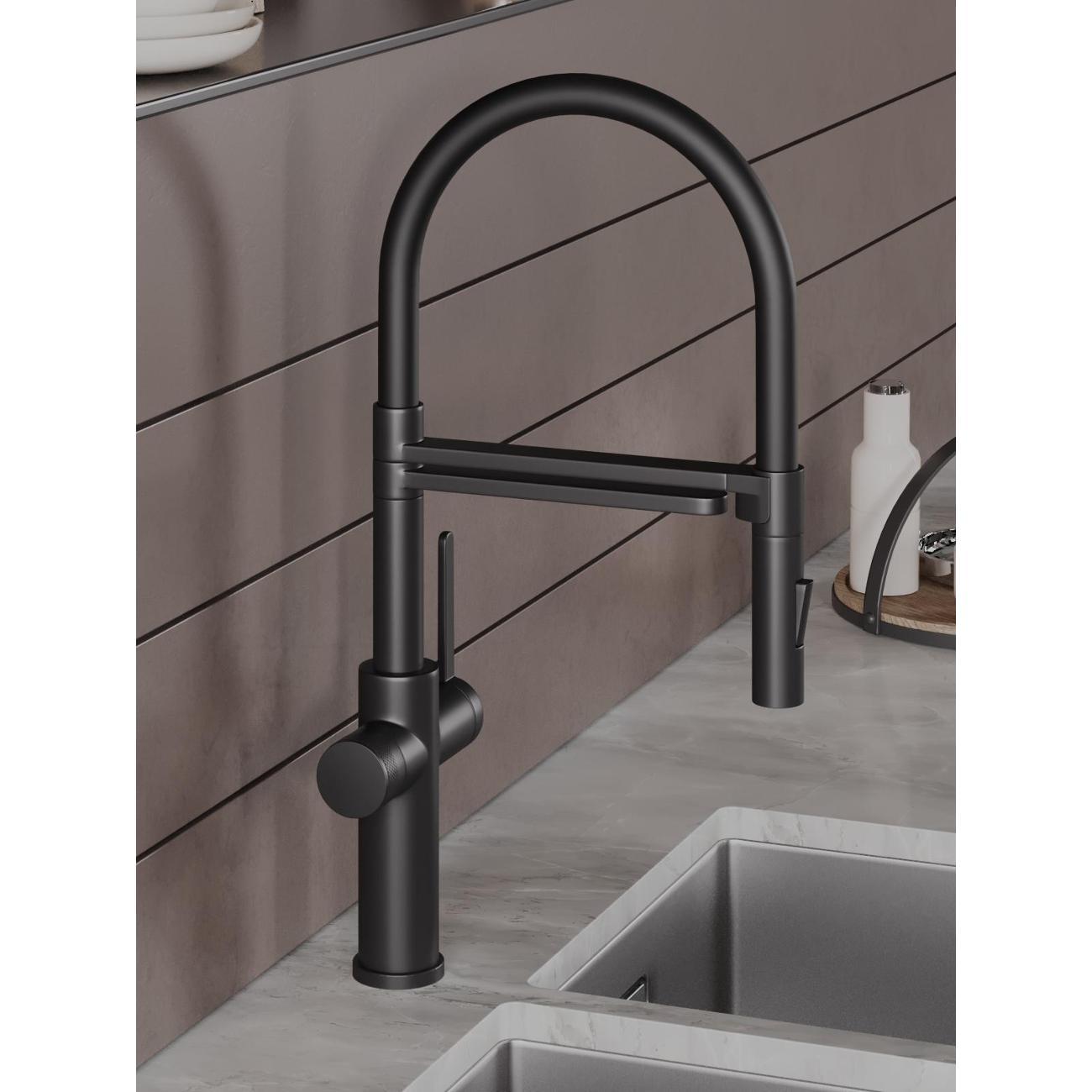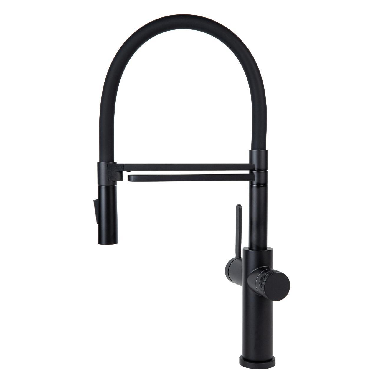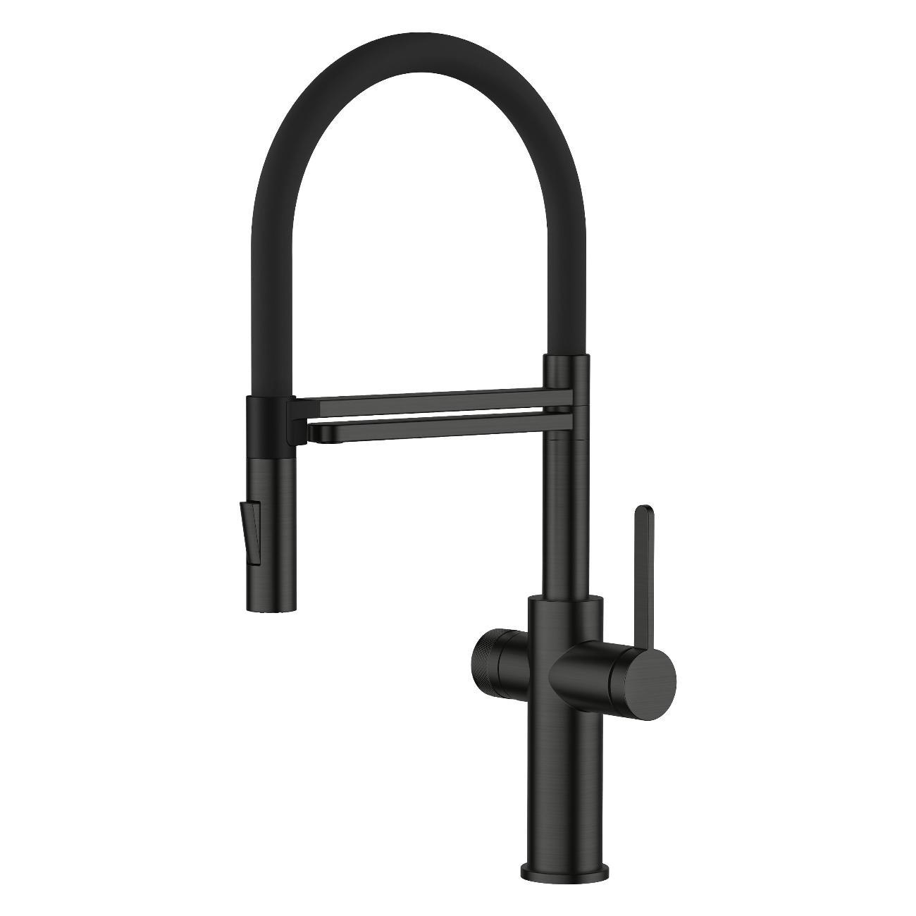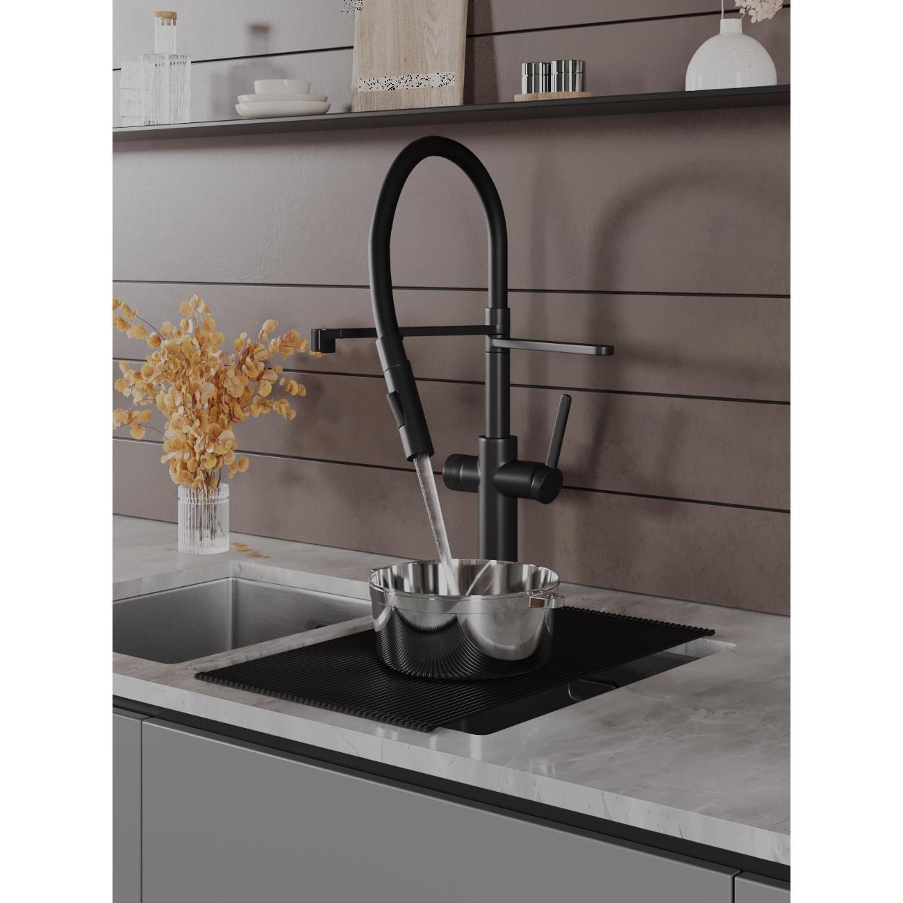 Однозахватный смеситель для кухни с гибким поворотным изливом Agger Elegant с возможностью подключения фильтра – эргономичное решение для тех, кто заботится о своем здоровье и здоровье близких. Фирменный керамический картридж Agger и эргономичный рычаг делают легким управление напором и температурой воды. Корпус изделия изготовлен из высококачественной нержавеющей стали, не подверженной коррозии от длительного контакта с водой. Покрытие в цвете матовый черный, за которым просто ухаживать мягкой салфеткой, нанесено методом порошковой окраски с многоступенчатой системой подготовки и высокотемпературной обработкой. Встроенный аэратор Neoperl экономит воду и, обогащая струю воздухом, делает ее мягкой без брызг. Смеситель оснащен гибким изливом (2 режима струи), что упростит мытье посуды и гигиеническую уборку мойки. В комплекте гибкая подводка (600 мм). Стандарт подводки - 1/2. Гарантия 5 лет.