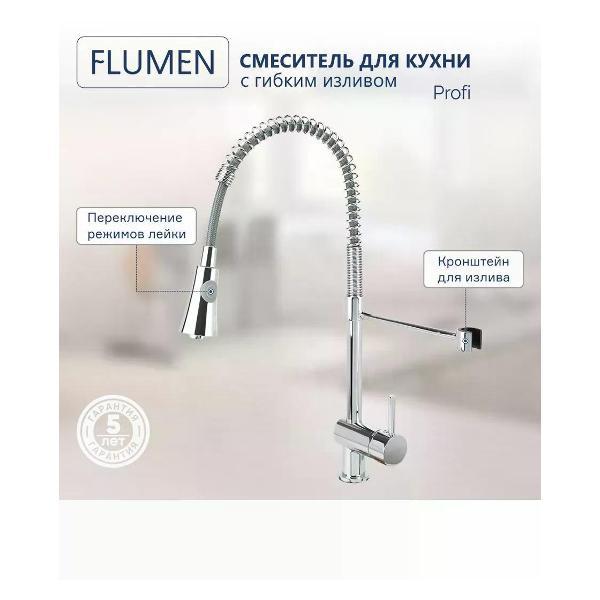 Кухонный смеситель FLUMEN Profi с высоким поворотным изливом. Корпус данного изделия изготовлен из высококачественной латуни, а излив из нержавеющей стали, что позволяет на протяжении долгого срока сохранять его первоначальный вид и функциональность. Керамический картридж, который гарантирует бесшумную работу, точность регулировки температуры и напора воды. Поворотный излив имеет гибкую конструкцию и оснащен специальной лейкой с двумя режимами подачи воды: обычный и душевой, переключение которых осуществляется кнопкой на корпусе лейки. Излив также оснащен пластиковым аэратором, который насыщает водную струю воздухом, делая ее мягкой и экономной. Для удобства подключения к системе водоснабжения изделие комплектуется гибкой подводкой длиной 500 мм. Марка: FLUMEN. Цвет: хром. Диаметр картриджа: 40 мм. Комплектация: гибкая подводка, крепление. Гарантия производителя: 5 лет. Страна производства: Китай. Вес: 2,5 кг. Данный смеситель не только органично впишется в интерьер любой кухни, но и обеспечит комфортное использование на протяжении многих лет.
