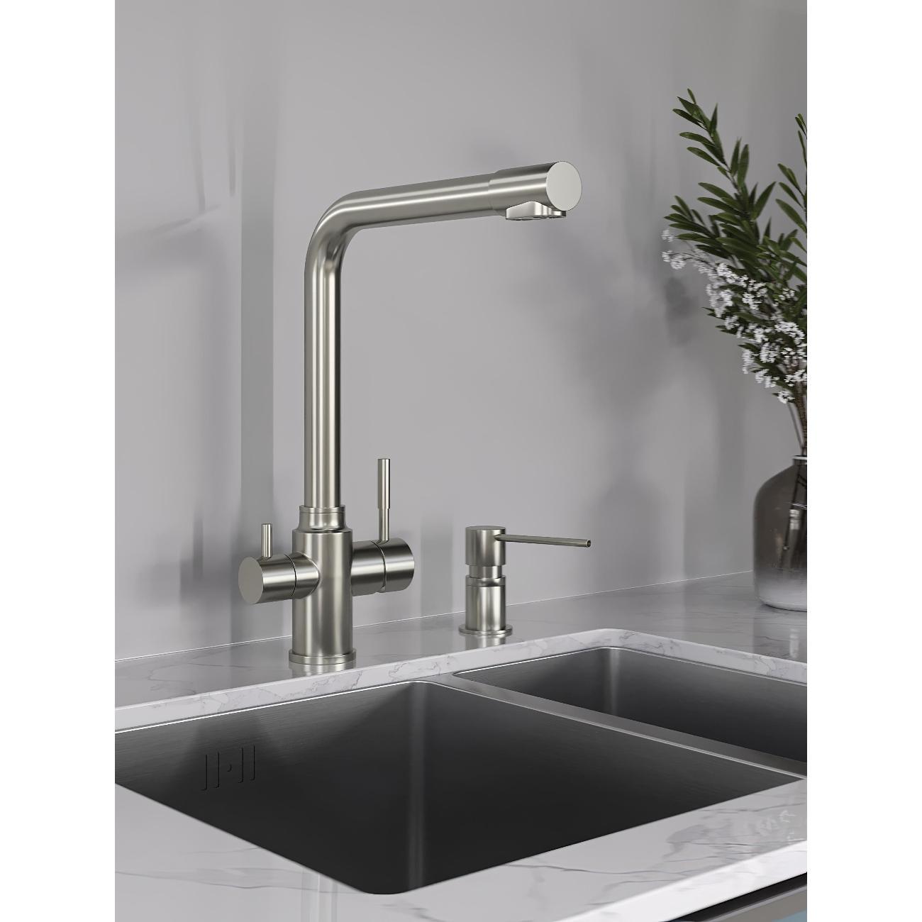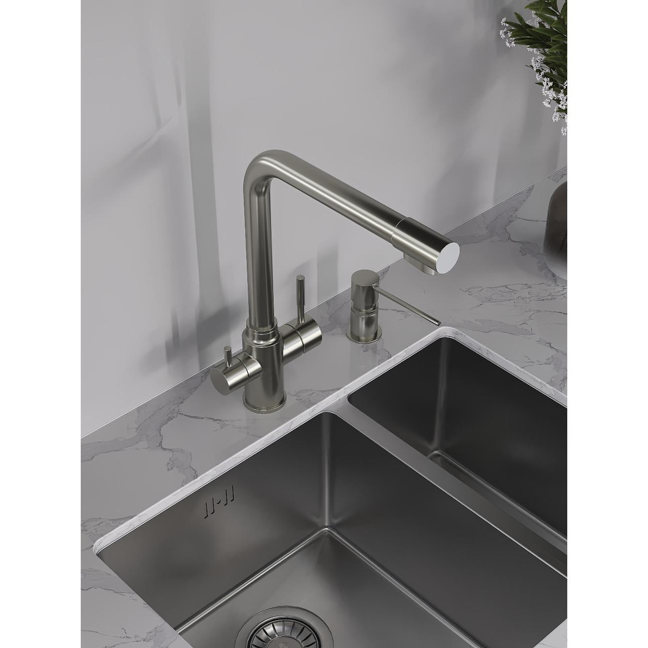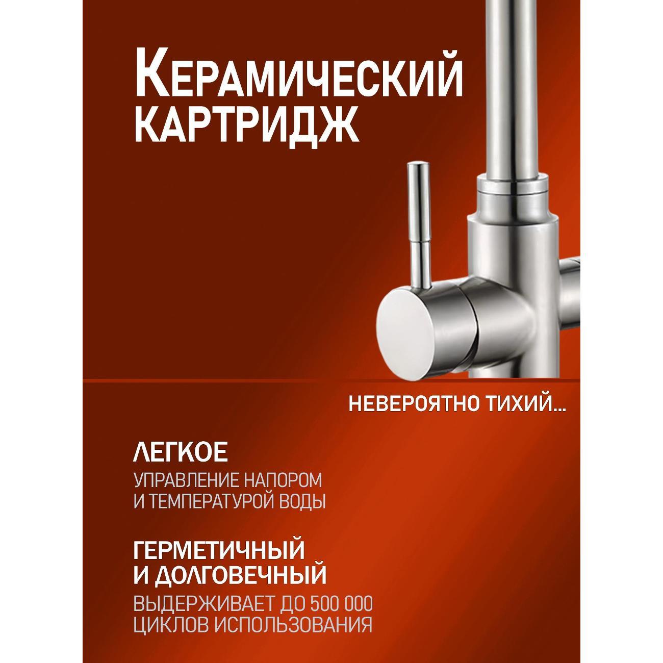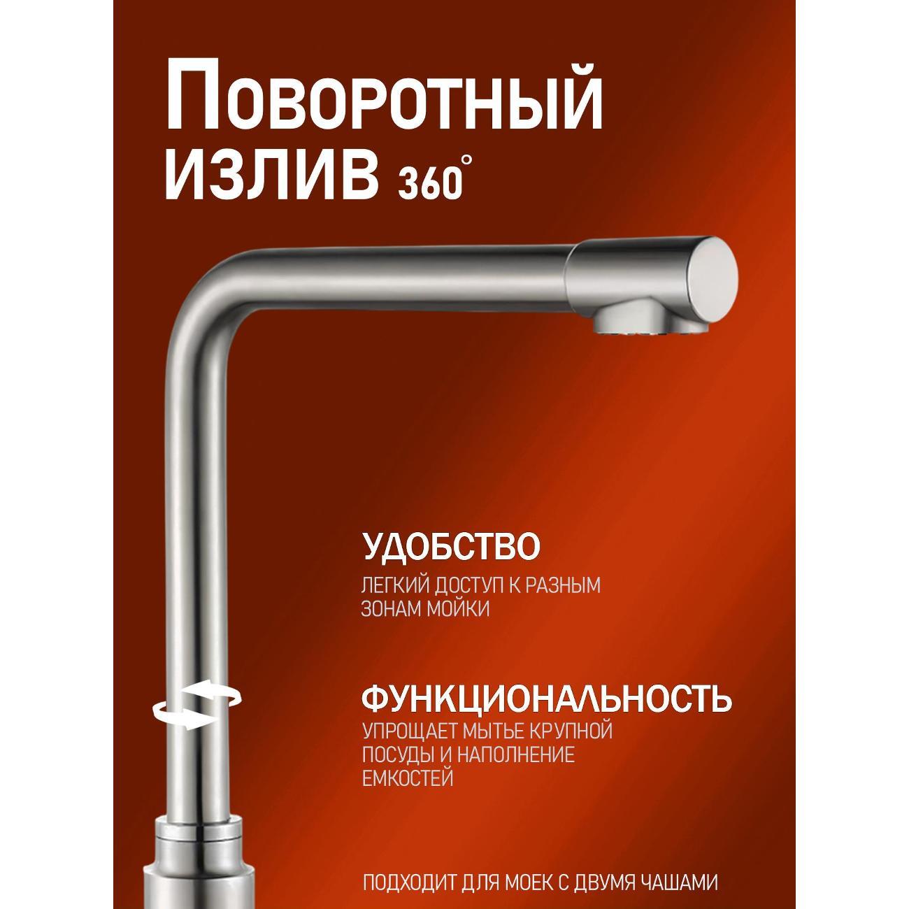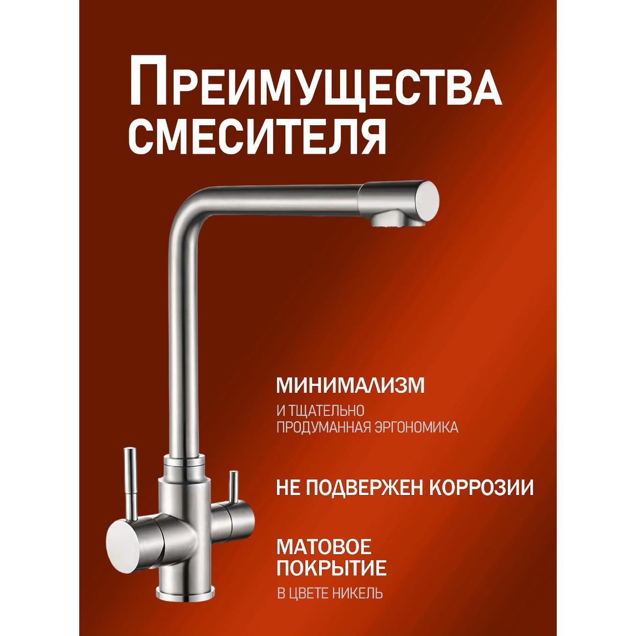 Однозахватный смеситель для кухни с поворотным изливом Orange Boni с возможностью подключения фильтра для воды – идеальное решение для тех, кто заботится о своем здоровье и здоровье близких. Благодаря фирменному картриджу Orange управление напором и температурой воды легкое и плавное. Корпус выполнен из нержавеющей стали, не подверженной коррозии от длительного контакта с водой. Износостойкое покрытие в цвете матовый никель нанесено по технологии вакуумного напыления (PVD), на нем незаметны разводы от высохшей воды и отпечатки пальцев. Встроенный аэратор экономит воду и, обогащая струю воздухом, делает её мягкой и без брызг.