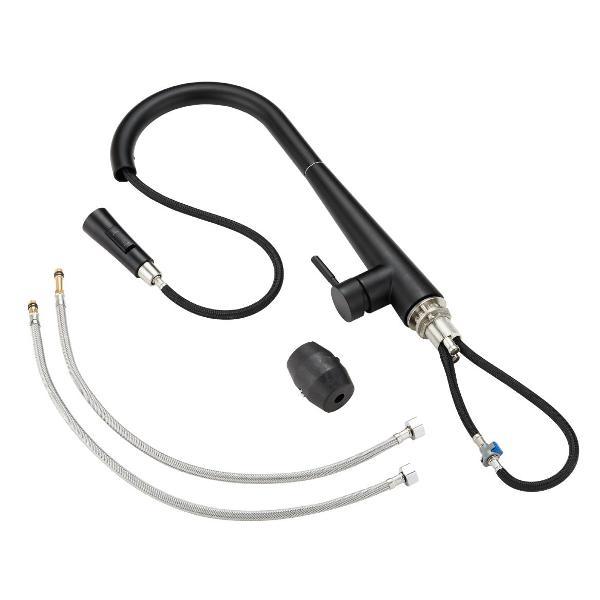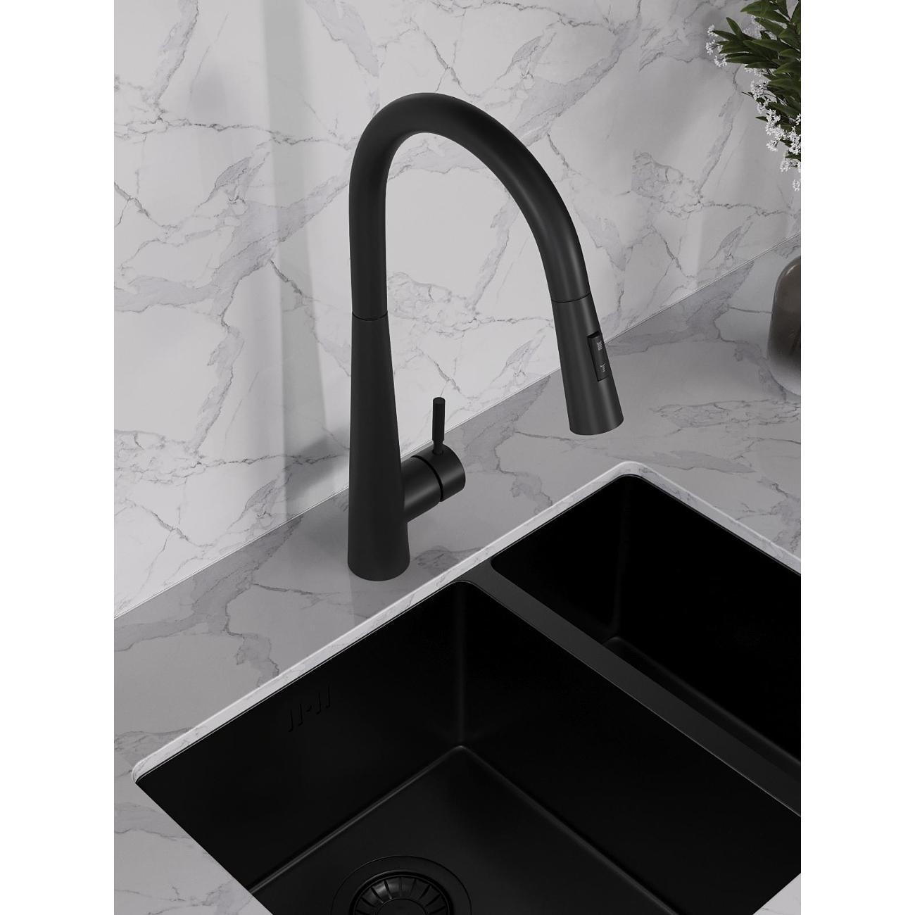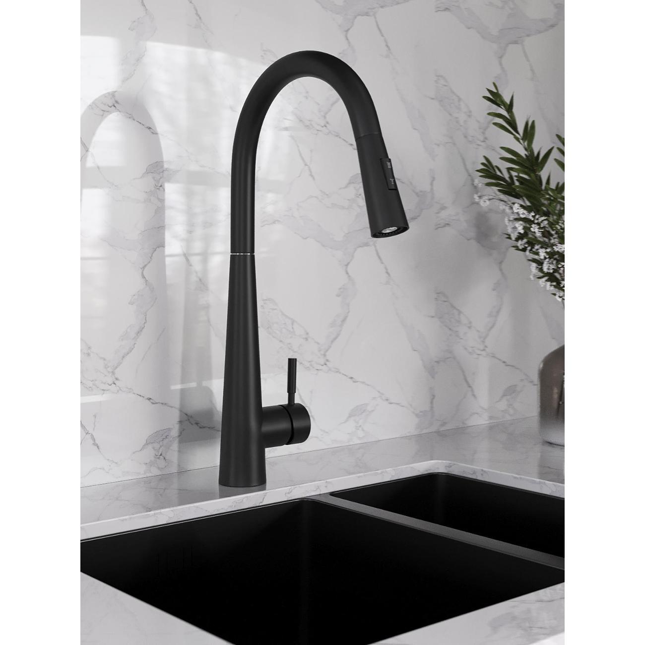 Однозахватный смеситель для кухни с поворотным изливом и вытяжным душем Orange Steel украсит современный интерьер. Благодаря фирменному картриджу Orange управление напором и температурой воды легкое и плавное. Корпус выполнен из нержавеющей стали, не подверженной коррозии от длительного контакта с водой. Износостойкое покрытие в цвете матовый черный нанесено методом порошковой окраски с многоступенчатой системой подготовки и температурной обработкой. Особенностью данной модели является наличие вытяжного излива (650 мм), что упростит мытье посуды и гигиеническую уборку мойки - 2 режима струи.