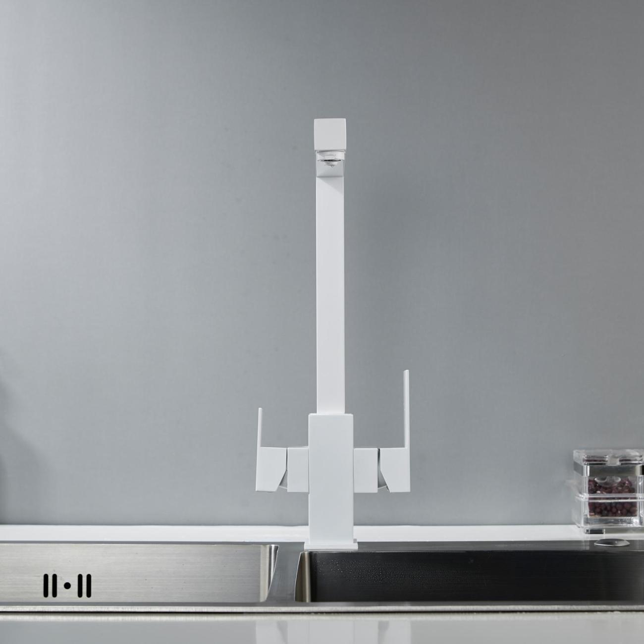 Особенность модели — функция подключения системы фильтрации питьевой воды. Смеситель оснащён двойным изливом: один подаёт обычную водопроводную воду, прошедшую через аэратор для мягкого, равномерного потока без брызг, а второй — отдельный канал — подаёт чистую, очищенную питьевую воду прямо из фильтра. Это значит, что вы можете одним движением переключаться между водой для мытья посуды и водой, пригодной для питья и приготовления чая или кофе, без необходимости использовать отдельные кувшины или насадки.