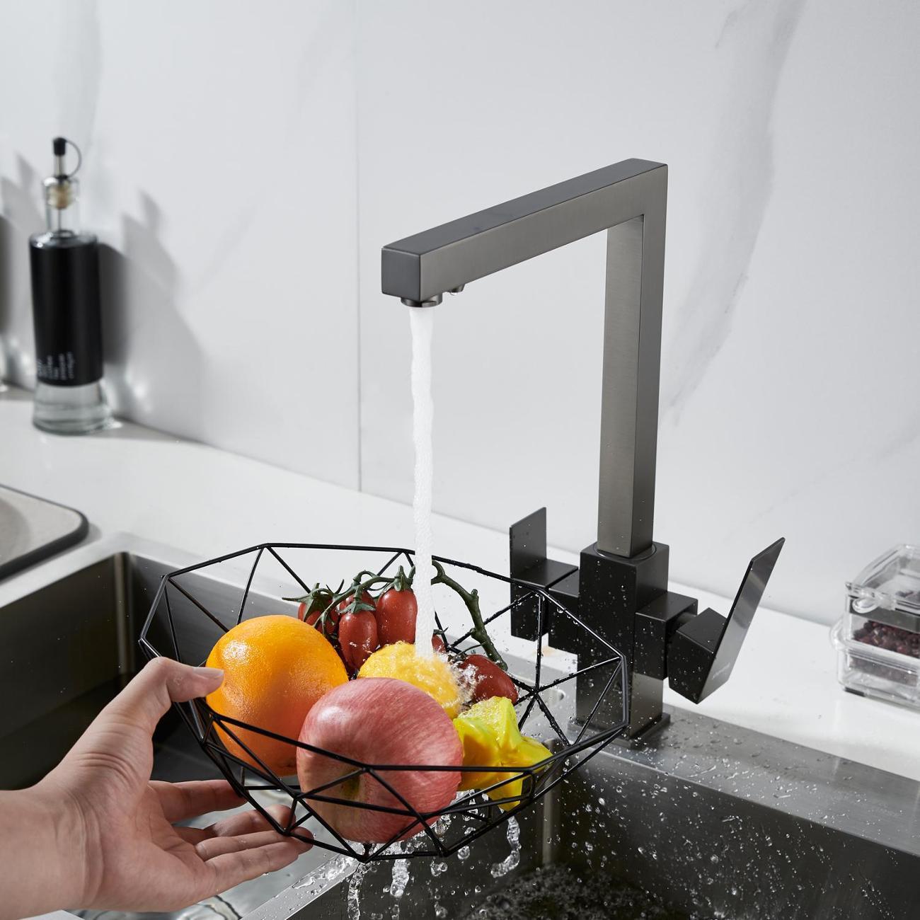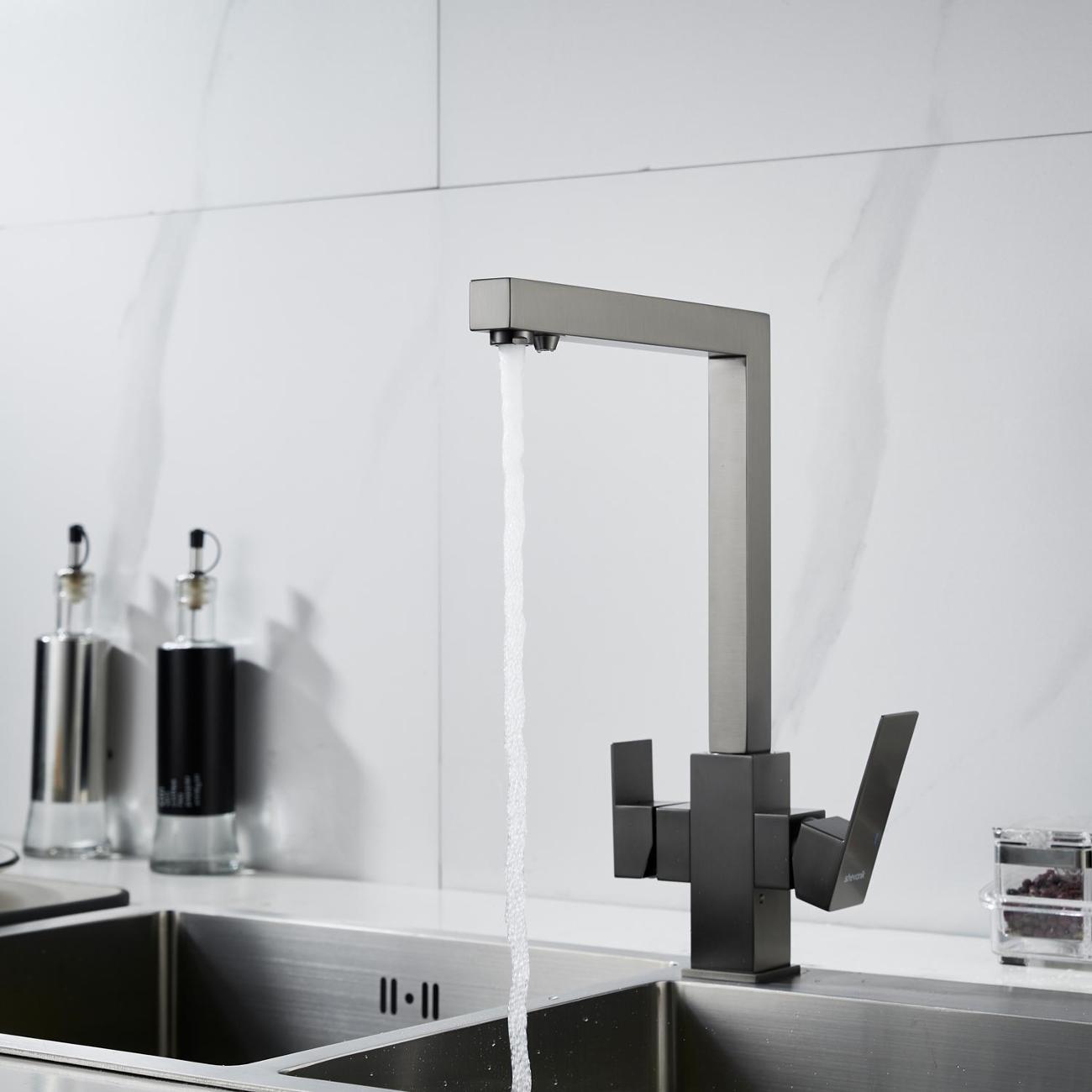 Особенность модели — функция подключения системы фильтрации питьевой воды. Смеситель оснащён двойным изливом: один подаёт обычную водопроводную воду, прошедшую через аэратор для мягкого, равномерного потока без брызг, а второй — отдельный канал — подаёт чистую, очищенную питьевую воду прямо из фильтра. Это значит, что вы можете одним движением переключаться между водой для мытья посуды и водой, пригодной для питья и приготовления чая или кофе, без необходимости использовать отдельные кувшины или насадки.