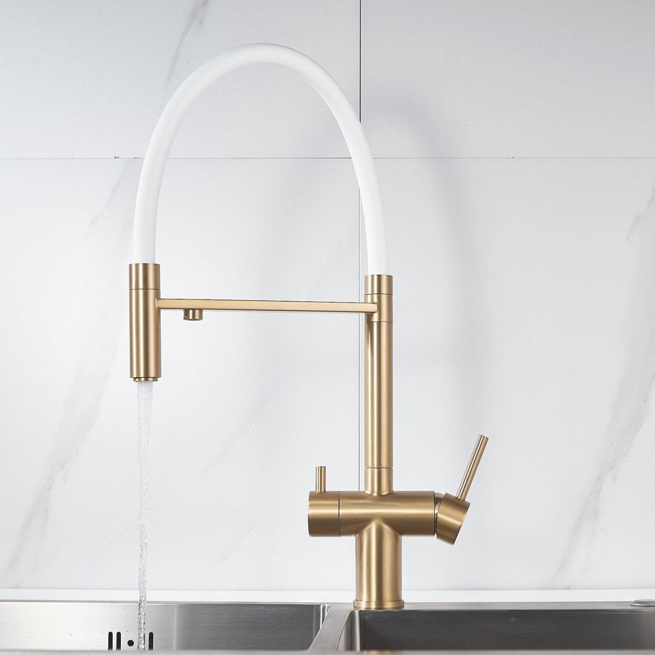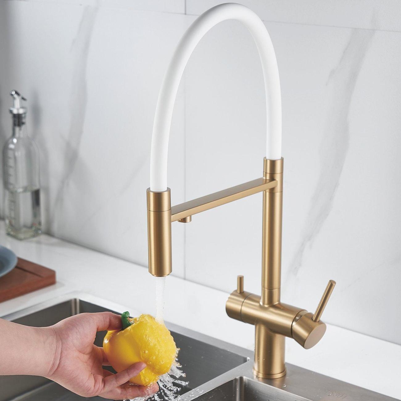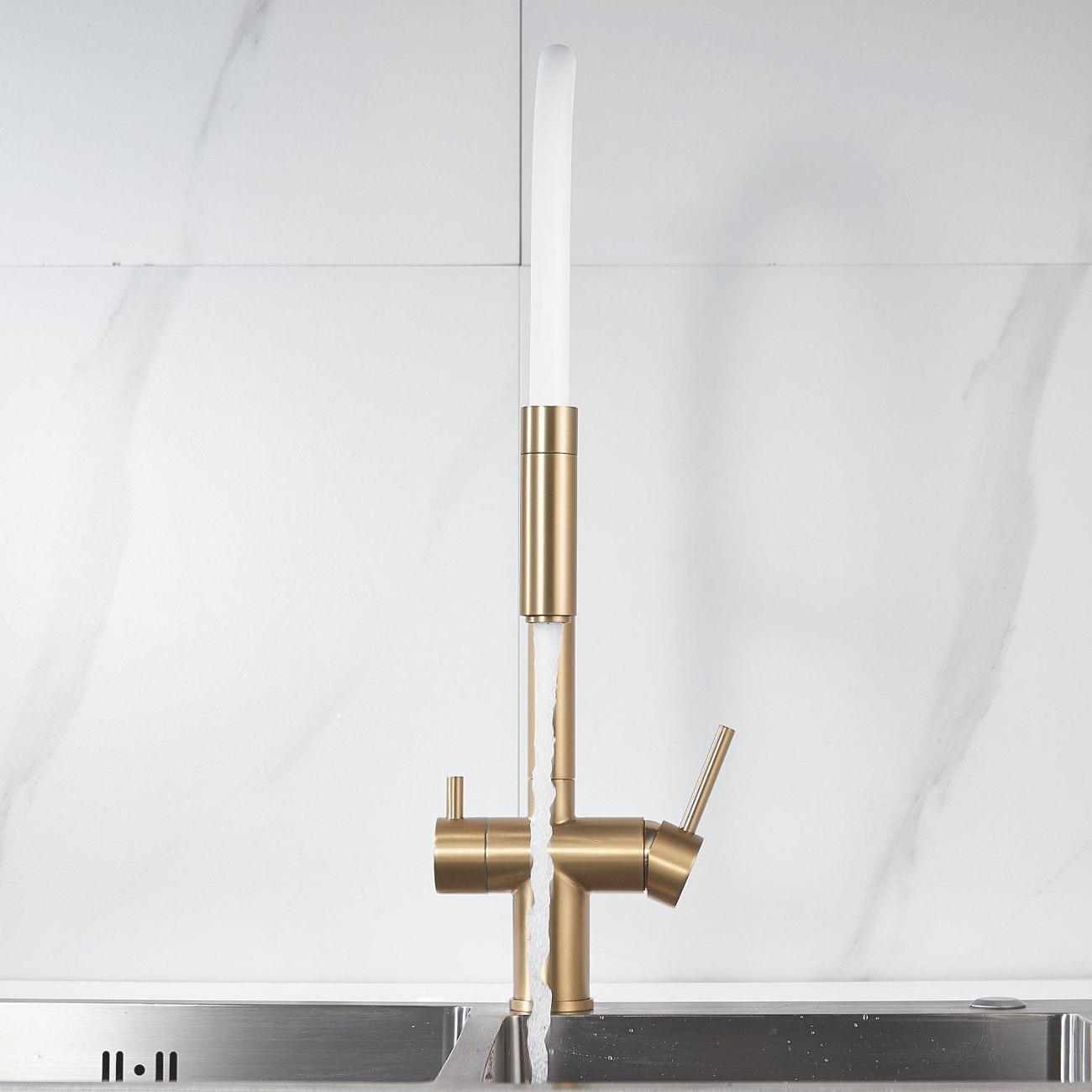 Смеситель для кухонной мойки Shevanik S178G в шикарном цвете "золотой сатин" с белым изливом - идеальное решение для вашей кухни! Изготовленный из нержавеющей стали, он гарантирует долговечность и стабильность на многие годы. Гибкий поворотный силиконовый излив обеспечивает максимальный комфорт при использовании, позволяя легко настроить струю воды под ваши нужды.