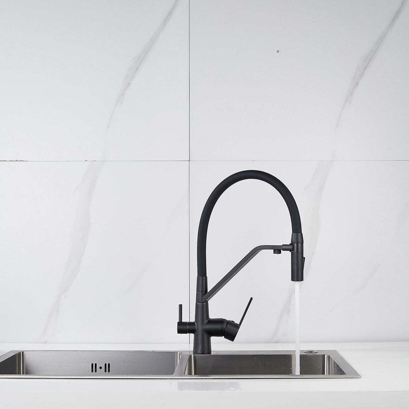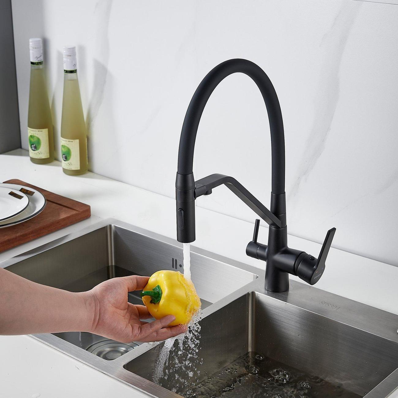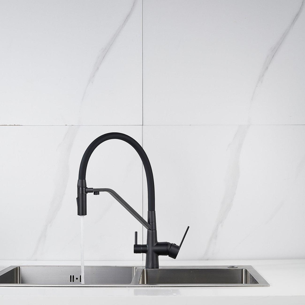 Смеситель для кухни с гибким изливом и подключением фильтра Shevanik S278H в модном черном цвете – это идеальное решение для тех, кто ценит комфорт и функциональность. Изготовленный из высококачественной латуни, этот смеситель обеспечивает долговечность и надежность в использовании.