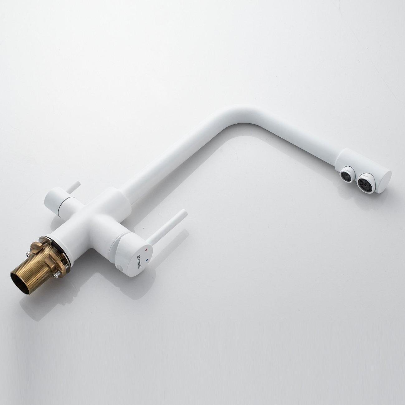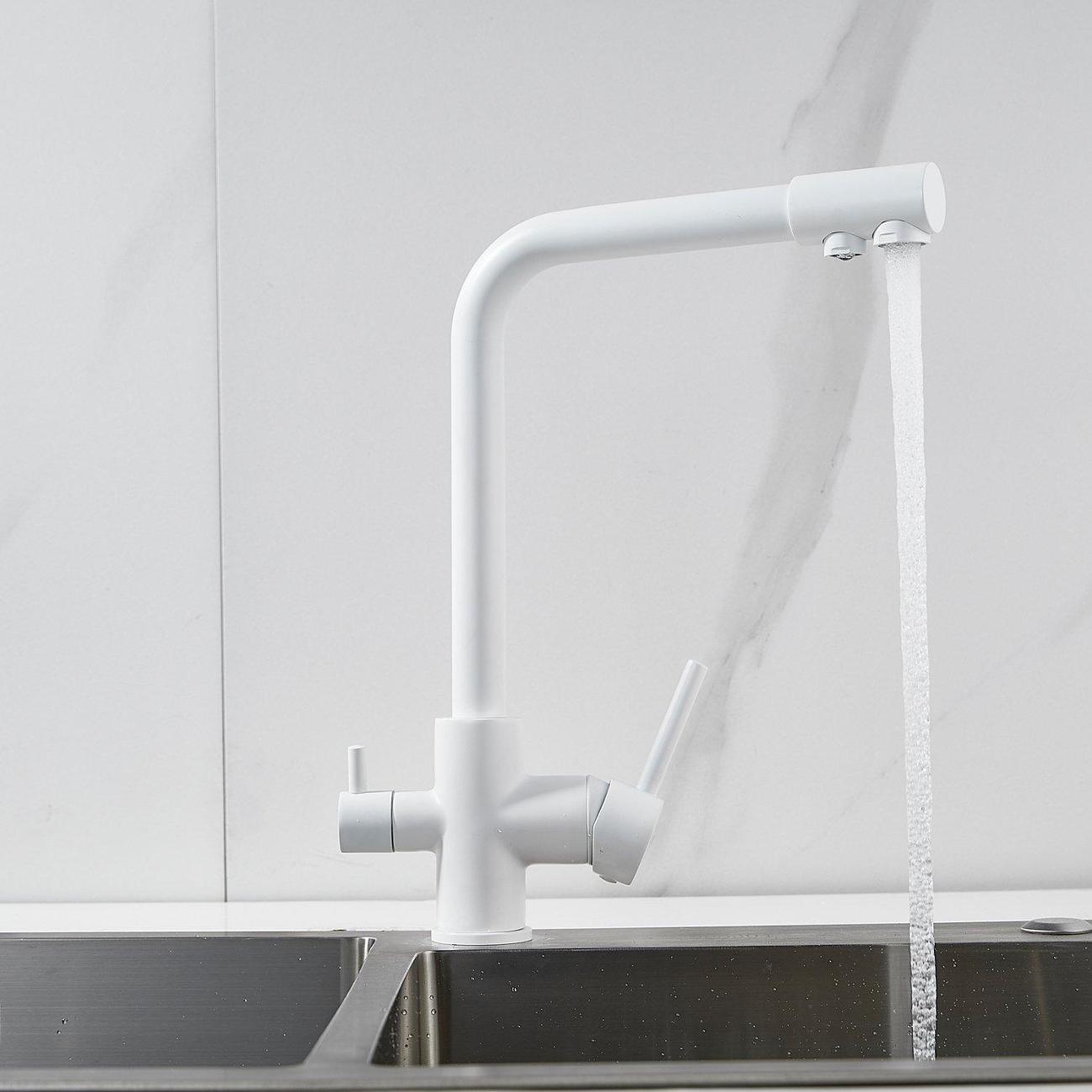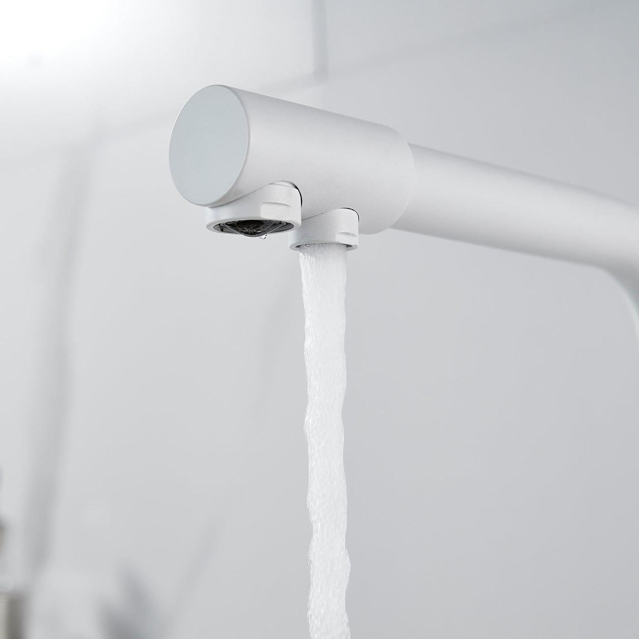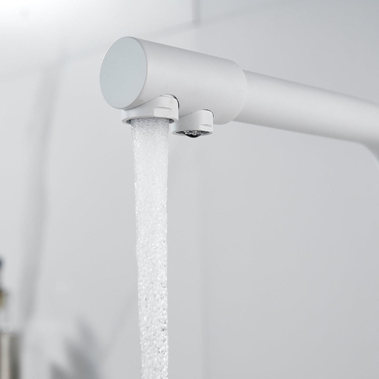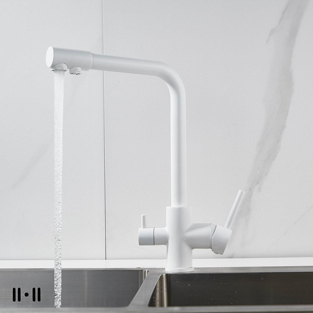 Во-первых, матовый белый цвет подойдет к любому дизайну кухни и будет гармонично смотреться в любом интерьере. Во-вторых, поворотный излив позволит легко настроить струю воды под любые ваши нужды, а встроенный канал для питьевой воды облегчит процесс фильтрации и подачи воды.