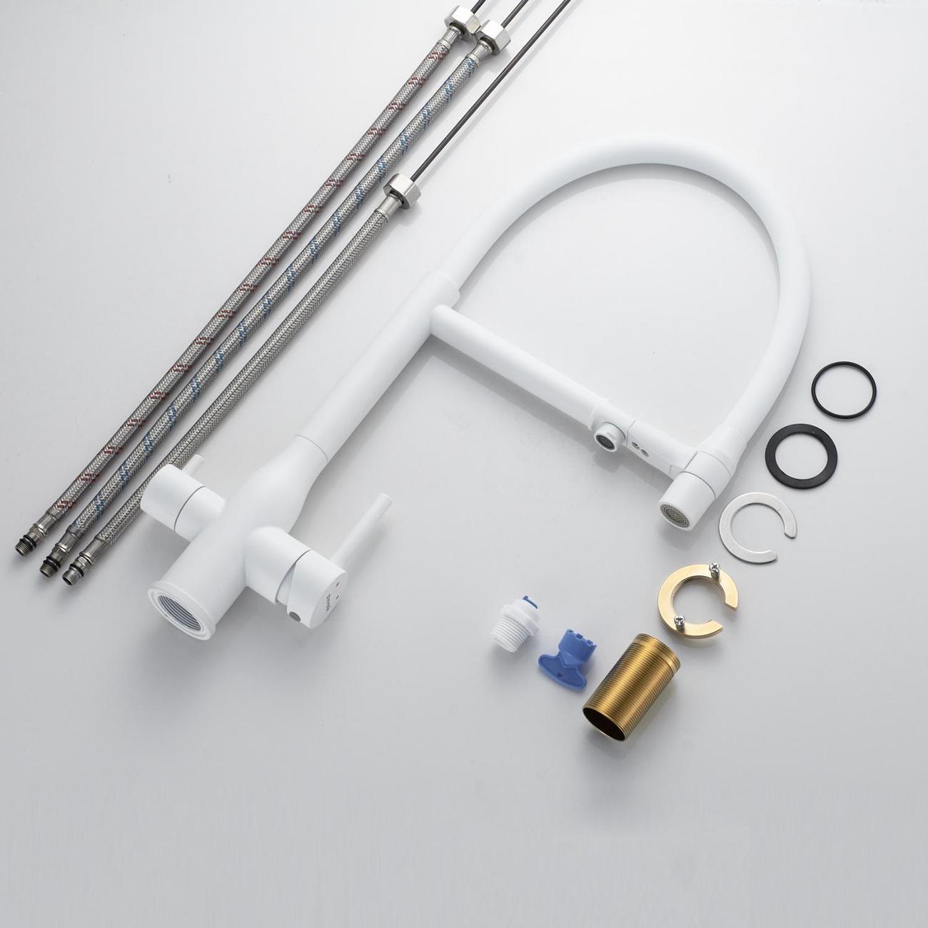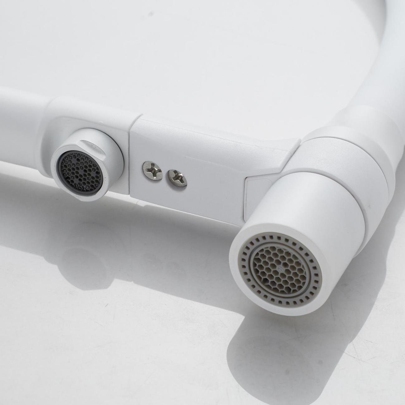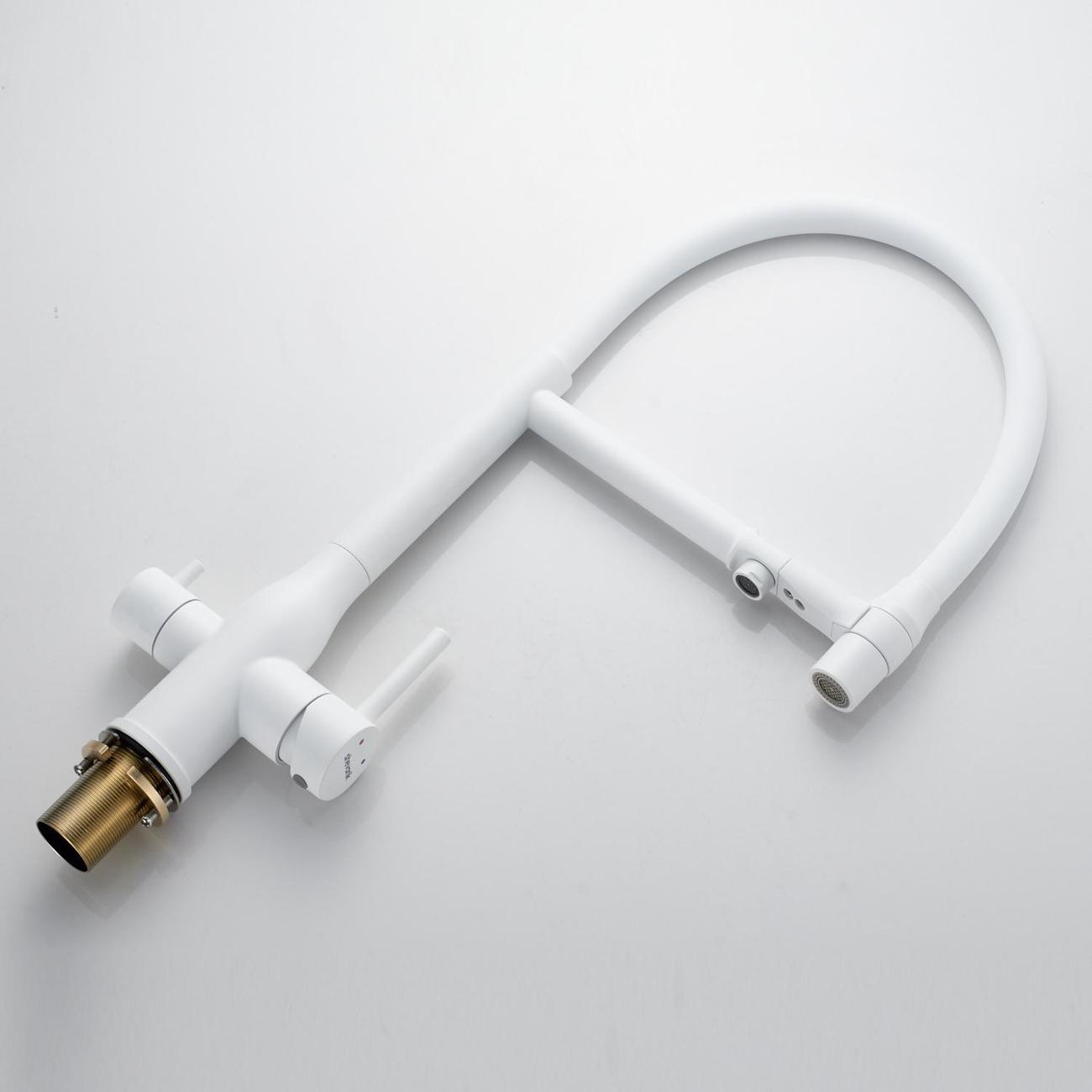 Для водопроводной воды предусмотрен гибкий излив с дополнительным режимом «душ»: достаточно повернуть кончик излива, чтобы переключиться на мягкий рассеивающий поток. В положении покоя излив надёжно фиксируется на основании смесителя с помощью магнитов. Особая деталь конструкции — поверхность вокруг магнитов выполнена из ABS‑пластика, что полностью исключает риск повреждения лакокрасочного покрытия соприкасающихся элементов и сохраняет эстетичный вид смесителя на долгие годы.