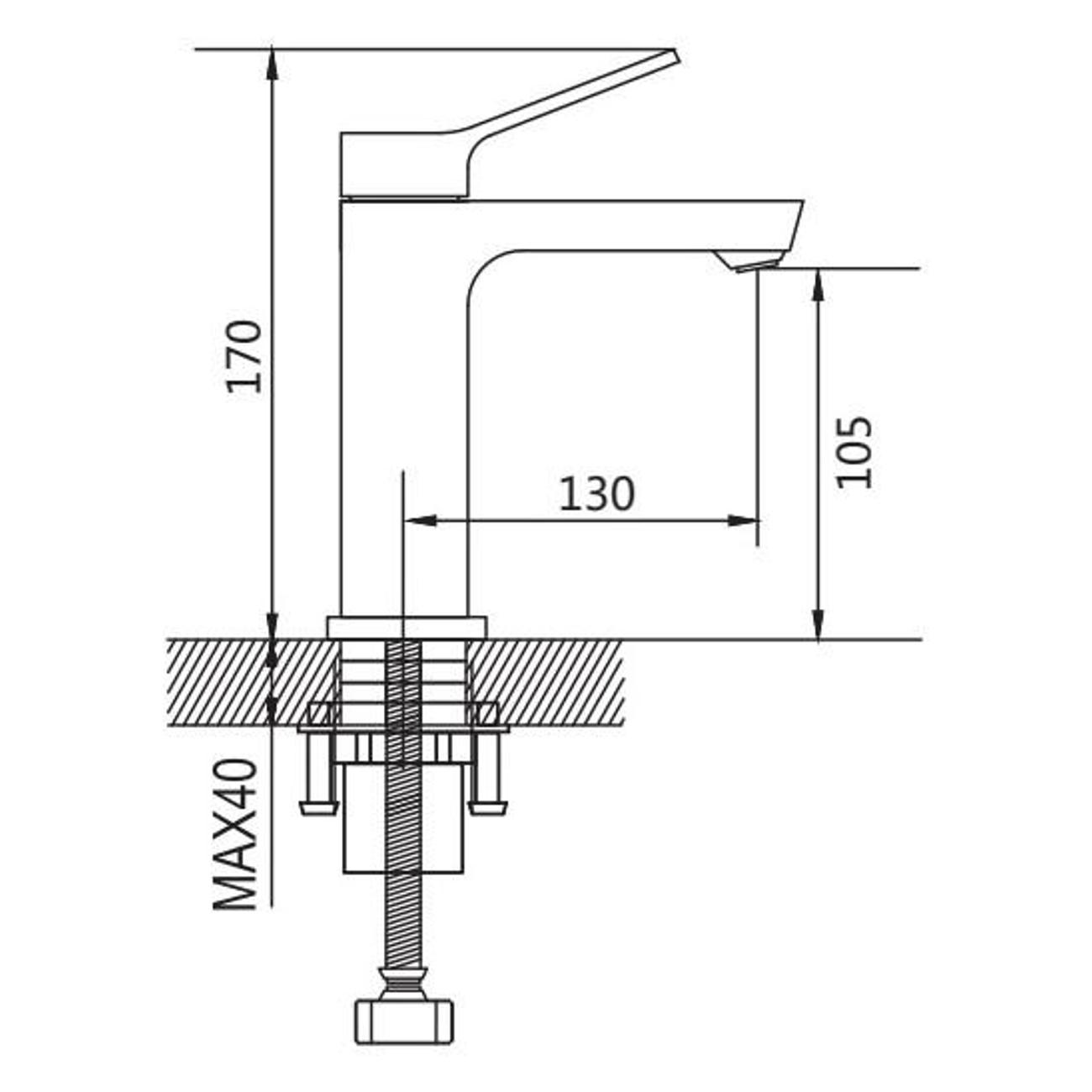 Установка смесителя осуществляется при помощи гайки, а в комплекте уже идёт гибкая подводка длиной 40 см с стандартным размером 1/2".