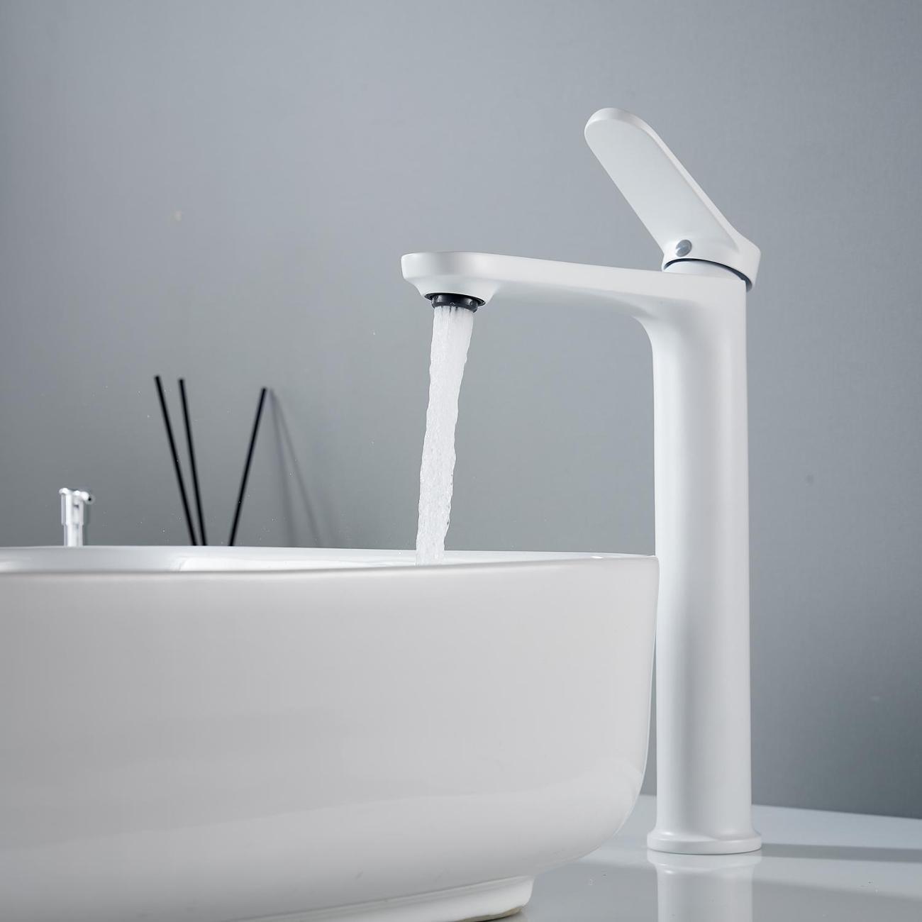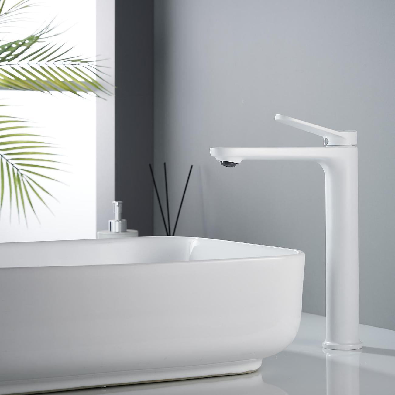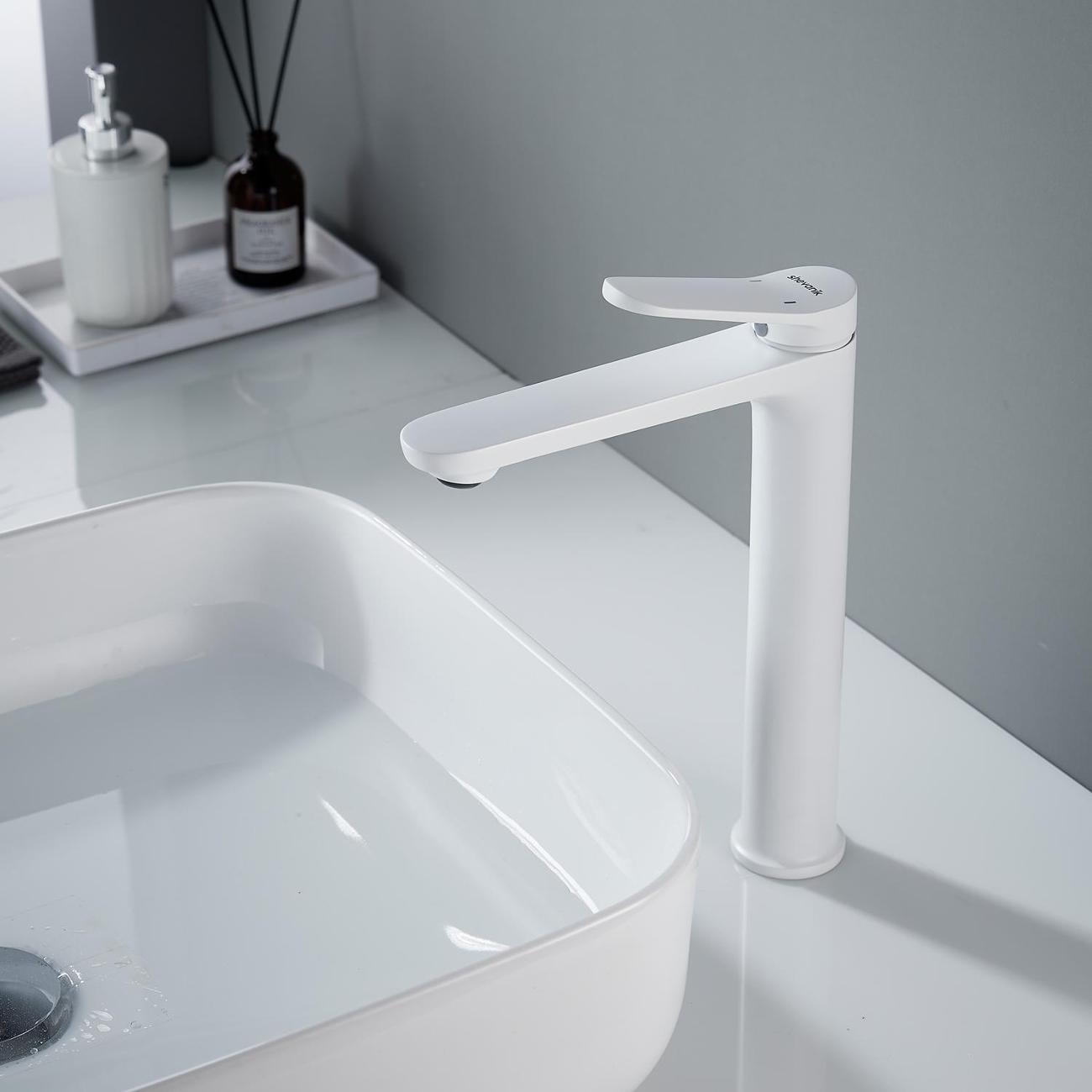 Высокий смеситель для раковины Shevanik S4311C в белом матовом цвете — идеальное решение для современных интерьеров, особенно для раковин-чаш. Его современный дизайн с плавными линиями придаст вашей ванной комнате элегантность и стиль. Смеситель оснащён надёжным керамическим картриджем и удобным рычажным управлением, что обеспечивает долговечность и простоту использования.