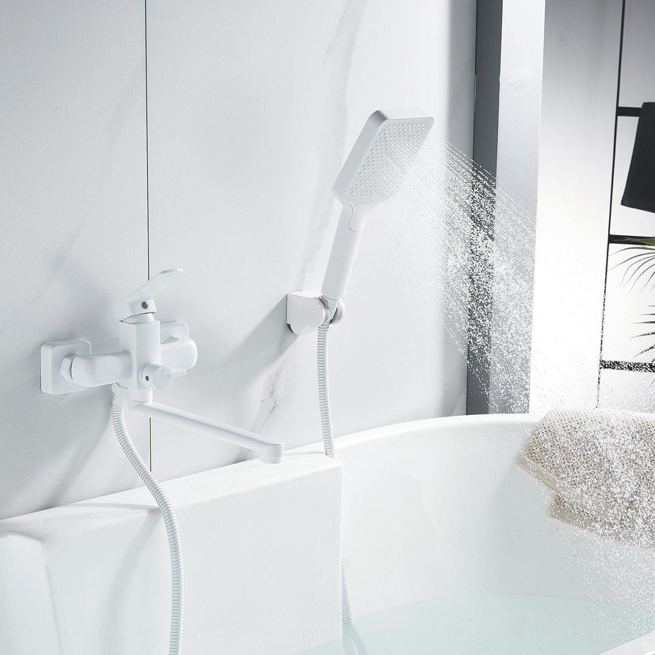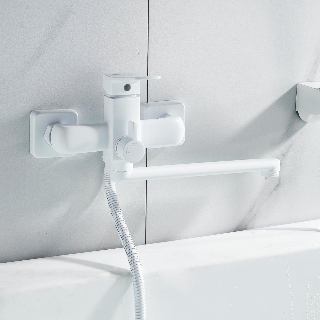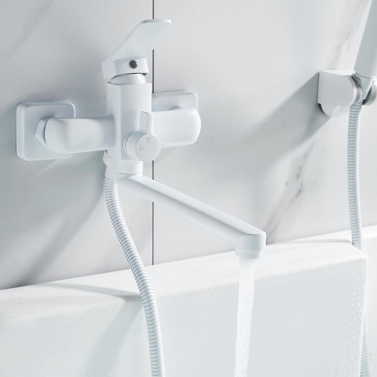 Смеситель оснащён длинным поворотным изливом и двухрежимной душевой лейкой из ABS-пластика. В комплекте поставки эксцентрики, настенный держатель душевой лейки и душевой шланг длиной 150 см.