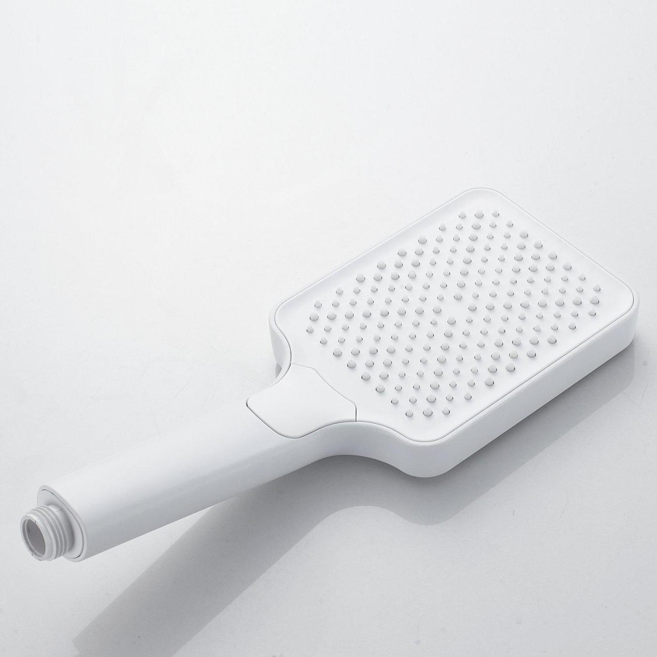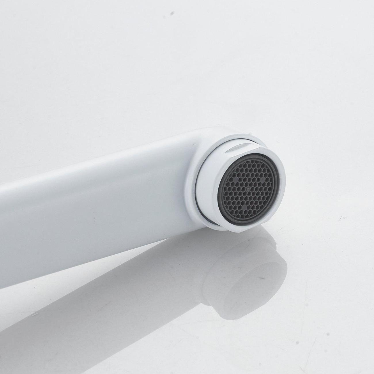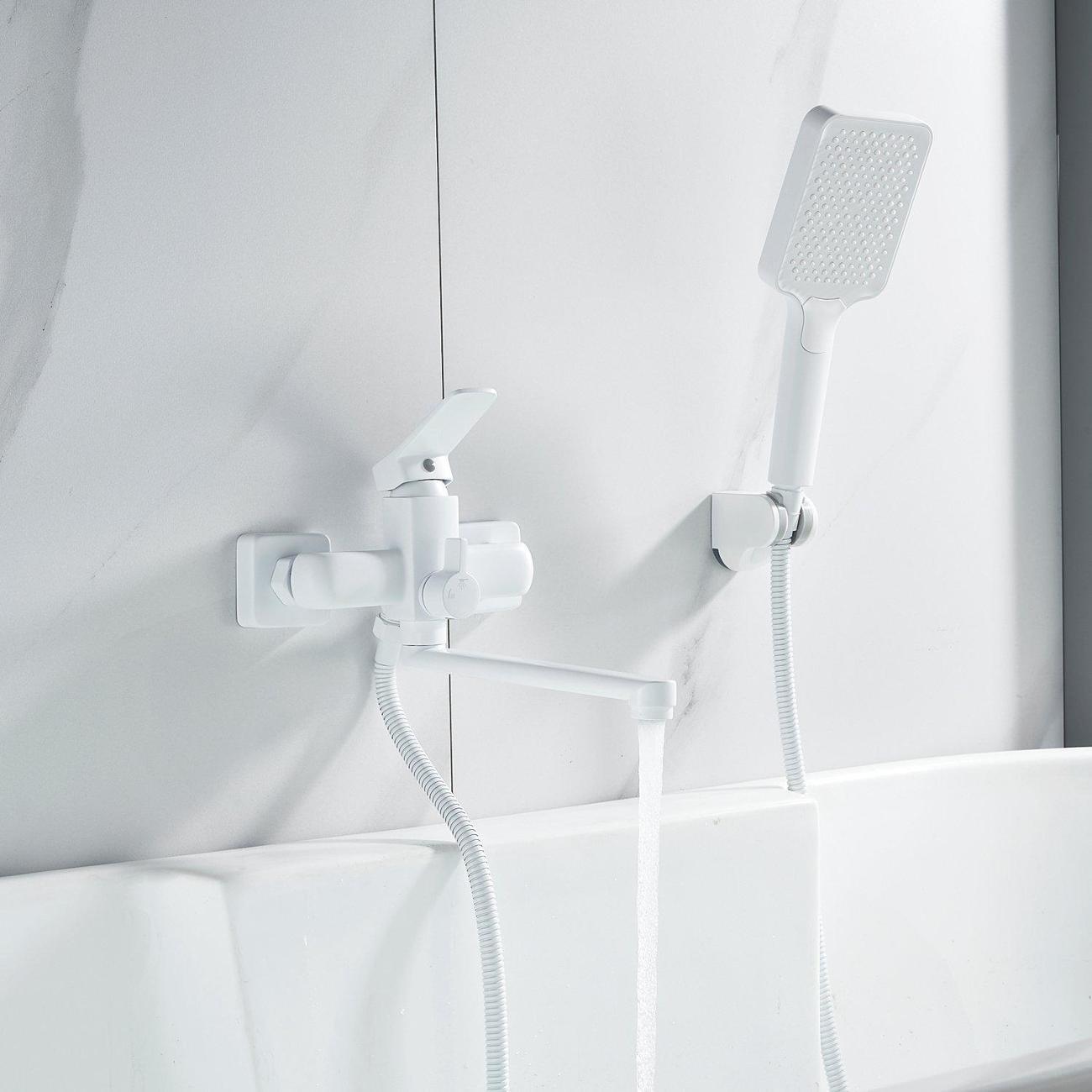 Смеситель оснащён длинным поворотным изливом и двухрежимной душевой лейкой из ABS-пластика. В комплекте поставки эксцентрики, настенный держатель душевой лейки и душевой шланг длиной 150 см.