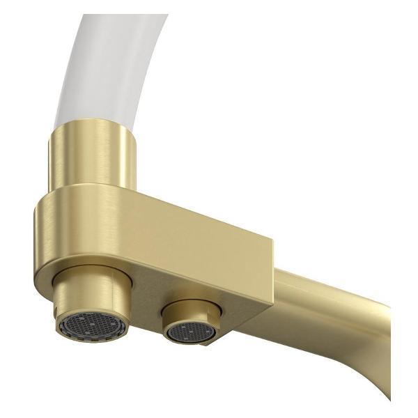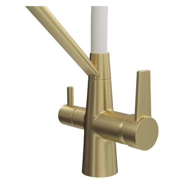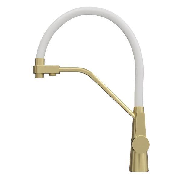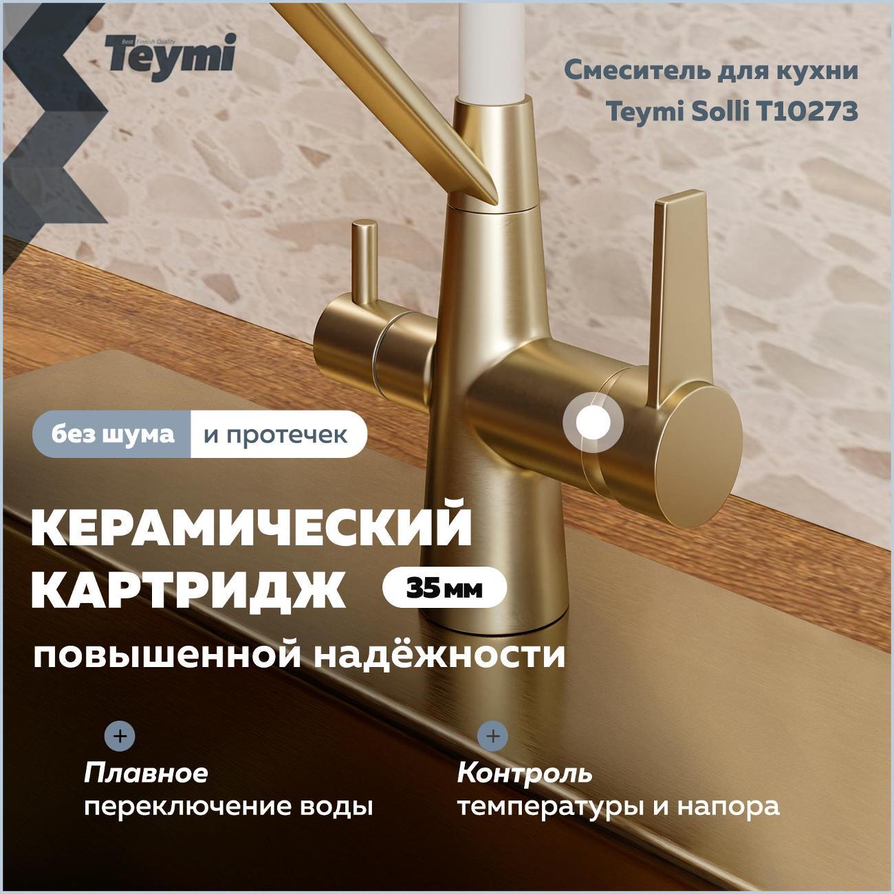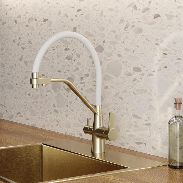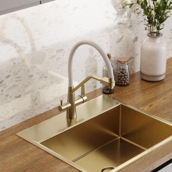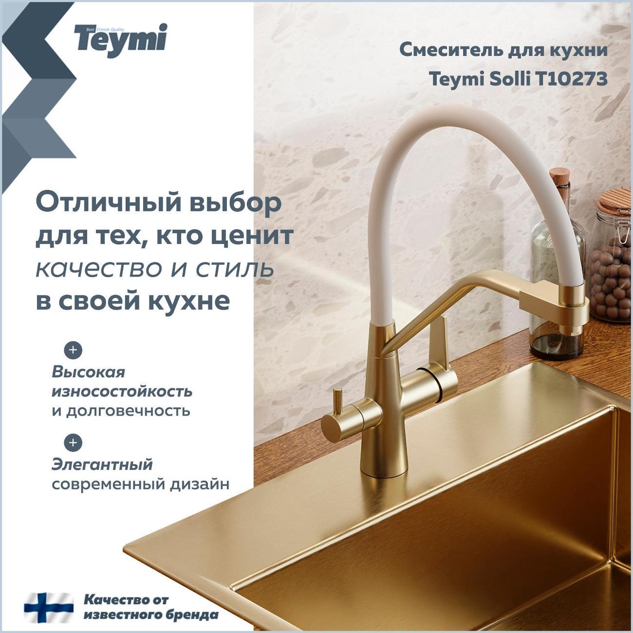 Смеситель для кухни корпус золото матовый излив белый Teymi Solli T10273 — современное решение для тех, кто ценит функциональность, удобство и стиль в каждой детали интерьера. Модель из коллекции Solli сочетает элегантный внешний вид и продуманную конструкцию, обеспечивая комфортное использование в повседневной работе на кухне. Гибкий поворотный излив позволяет легко направлять поток воды в нужную сторону — это особенно удобно при мытье посуды, овощей и наполнении крупных емкостей. Встроенный аэратор насыщает воду воздухом, формируя мягкую струю без брызг и снижая расход воды до 40%. Главная особенность модели — система 2-в-1 для подачи питьевой воды. Потоки разделены и управляются отдельным рычагом, что позволяет пользоваться как обычной водой, так и фильтрованной без установки дополнительного крана. Такое решение не только экономит место на мойке, но и делает использование максимально удобным. Корпус выполнен из прочного цинка с износостойким покрытием, устойчивым к царапинам и загрязнениям. Керамический картридж обеспечивает плавную регулировку напора и температуры, продлевая срок службы изделия. Боковое расположение рычага упрощает управление и делает эксплуатацию эргономичной даже в ограниченном пространстве. Смеситель устанавливается в одно отверстие и подходит для большинства моек. Современный дизайн модели гармонично вписывается в кухни различных стилей — от минимализма до лофта. Teymi Solli T10273 — это надежный и стильный кухонный смеситель, объединяющий функциональность, практичность и финское качество.