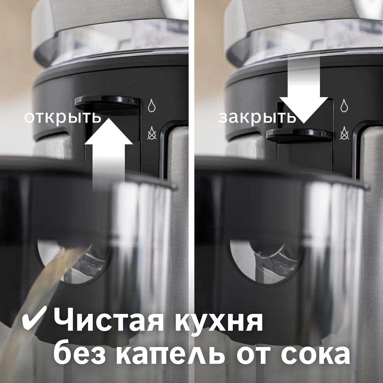 Работает модель на трех скоростях. Первая подходит для измельчения ягод, вторая — фруктов и овощей, третья — твердых продуктов. Помещать их в соковыжималку можно целиком благодаря широкому (8,4 см в диаметре) загрузочному отверстию. Объем резервуара для сока составляет 1,5 л. На чашу нанесена градуировка. Жмых собирается в специальный отсек объемом 3 л. Благодаря крышке жидкость не разбрызгивается во время работы прибора. Есть противокапельная система, предотвращающая попадание сока на стол, защита от случайного включения и перегрева.