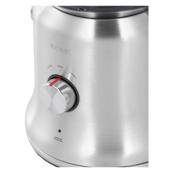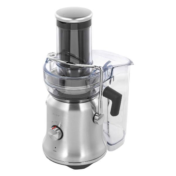 Мощность двигателя достигает 1300 Вт, запуск производится плавно. Прибор работает от сети 220 В. Скоростей работы две. Число оборотов варьируется от 6500 об/мин до 13000 об/мин. Благодаря высокоточной фильтрации мелкоячеистого фильтра сок очищается от мякоти. Фильтр с лазерной перфорацией поставляется в комплекте. Модель снабжена сепаратором пены и противокапельной системой. В целях безопасности присутствует защита от перегрузки и случайного включения.
