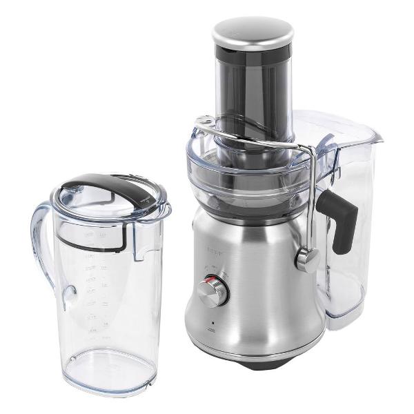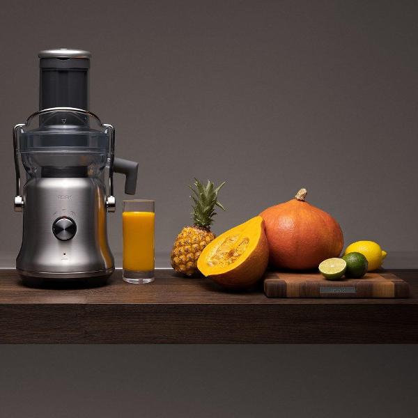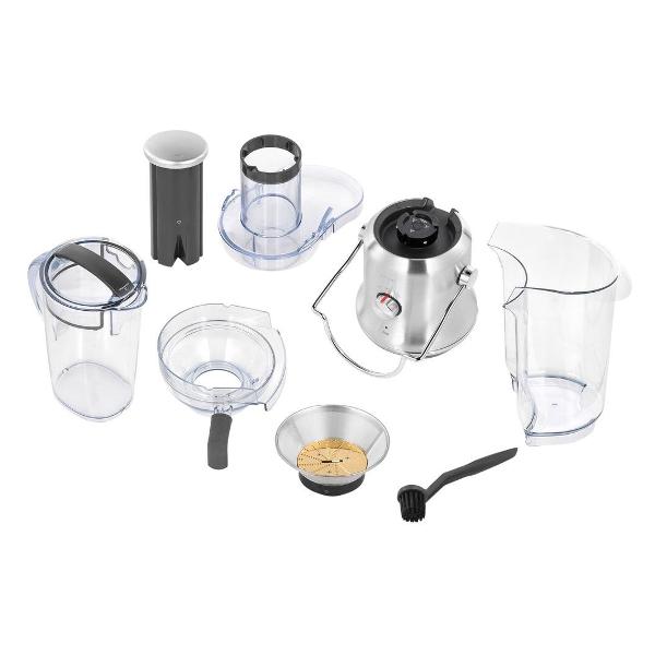 Стальной корпус устойчив к царапинам и сколам. Для устойчивости предусмотрены присоски, которые фиксируют корпус на столешнице. Кувшин снабжен герметичной крышкой, вмещает до 2 л сока. Он выполнен из пластика и предназначен не только для сбора сока, но и для его хранения. Съемный контейнер для жмыха объемом 3 л расположен за основанием корпуса, что делает модель компактной. Ее габариты составляют 33х45х22 см, вес — 6,2 кг.