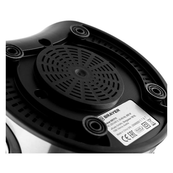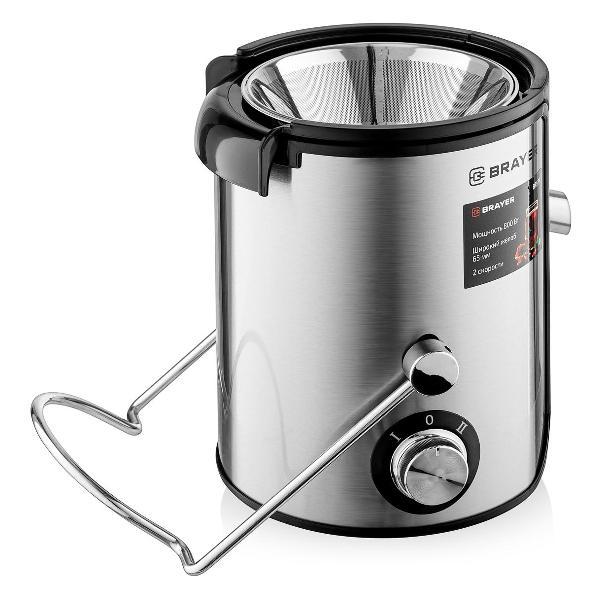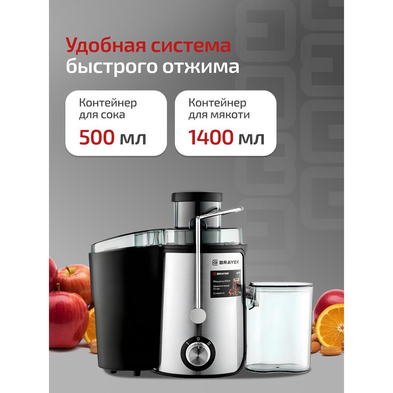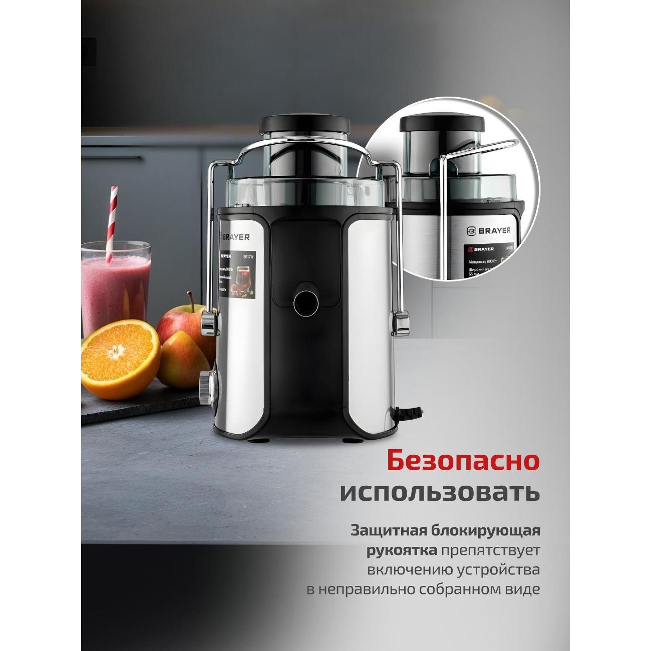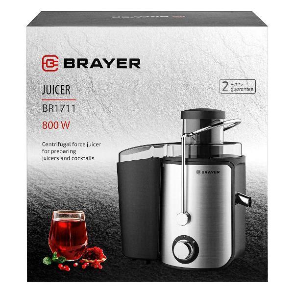Центробежная соковыжималка Brayer BR1711 оснащена электромотором 800 Вт, обеспечивающим скорость вращения до 18000 об/мин. Доступно два режима, система управления — механическая. Фрукты и овощи загружаются через отверстие 65 мм. Фильтр и шнек изготовлены из нержавеющей стали. Предусмотрены пластиковый кувшин для сока 0,5 л с крышкой и градуировкой и съемный контейнер для мякоти 1,4 л. Модель защищена от случайного включения, автоматически прекращает работу при перегреве и открытой крышке. Размеры — 20х30,5х28,5 см, вес — 2,8 кг.