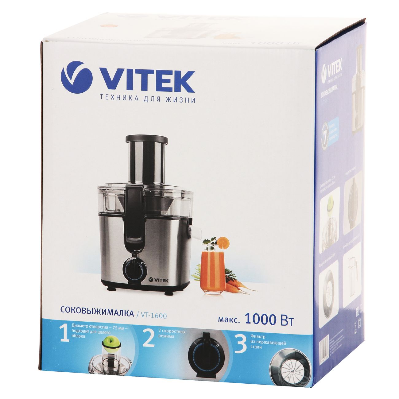 Центробежная соковыжималка Vitek VT-1600 – эффективная модель максимальной мощностью 1000 Вт, которая легко справляется и с мягкими, и с твёрдыми фруктами и овощами. Вы сможете сэкономить время: в горловину диаметром 75 мм пройдёт даже целое яблоко, так что вам не придётся предварительно заниматься нарезкой.