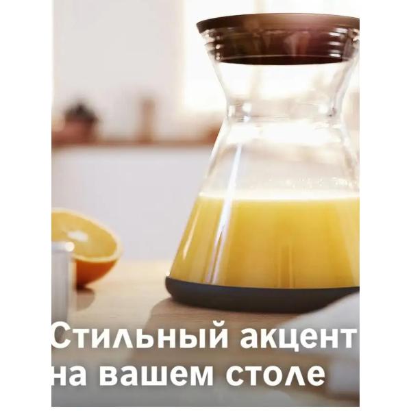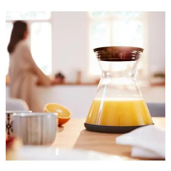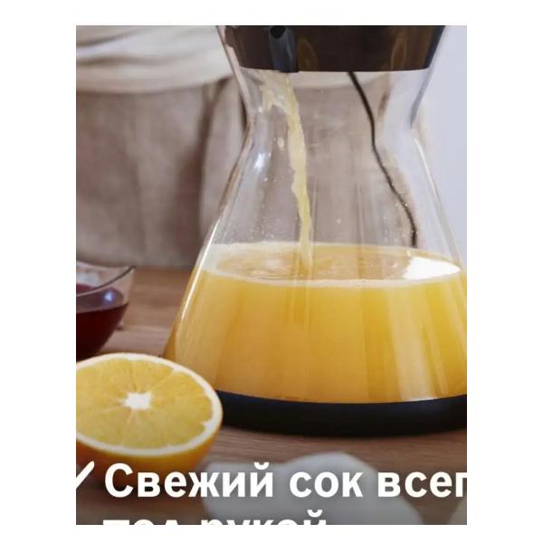 Компактные размеры пресса 310х170х170 мм и небольшой вес 1300 г обеспечивают компактное хранение на кухонной полке. Устройство функционирует от сети 220-240 В за счет электропровода длиной 1 м. Соковыжималка комплектуется крышками для графина и конуса. Прорезиненная подставка обеспечивает устойчивость, устройство не скользит по столешнице. Детали прибора — съемные, их можно мыть в посудомоечной машине.