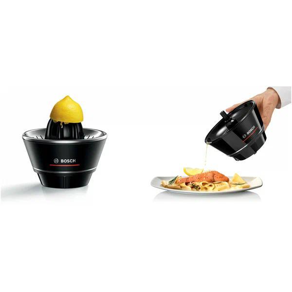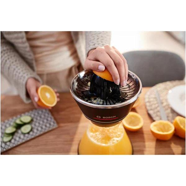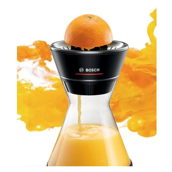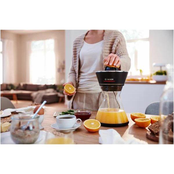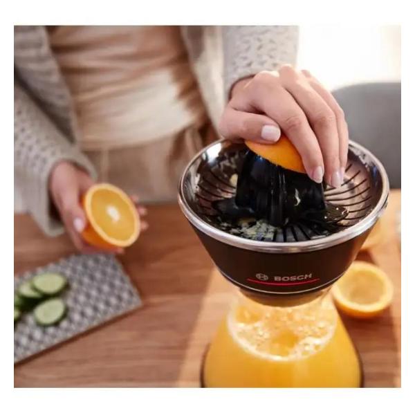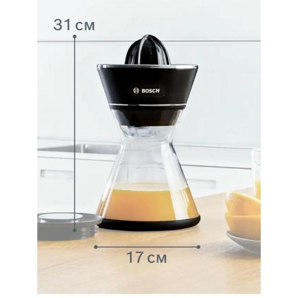 Соковыжималка для цитрусовых Bosch MCP72GPB, черный/прозрачный в стильном корпусе обладает мощностью 40 Вт, позволяющей быстро получить вкусные соки из апельсинов, мандаринов, лаймов и других фруктов. Прибор снабжен универсальным графином, в котором можно подавать свежевыжатый напиток к столу. Объем 1000 мл достаточен для семьи из трех-четырех человек. Чтобы начать пользоваться устройством, нужно просто нажать на конус. Фильтр выполнен из нержавеющей стали — долговечного материала.