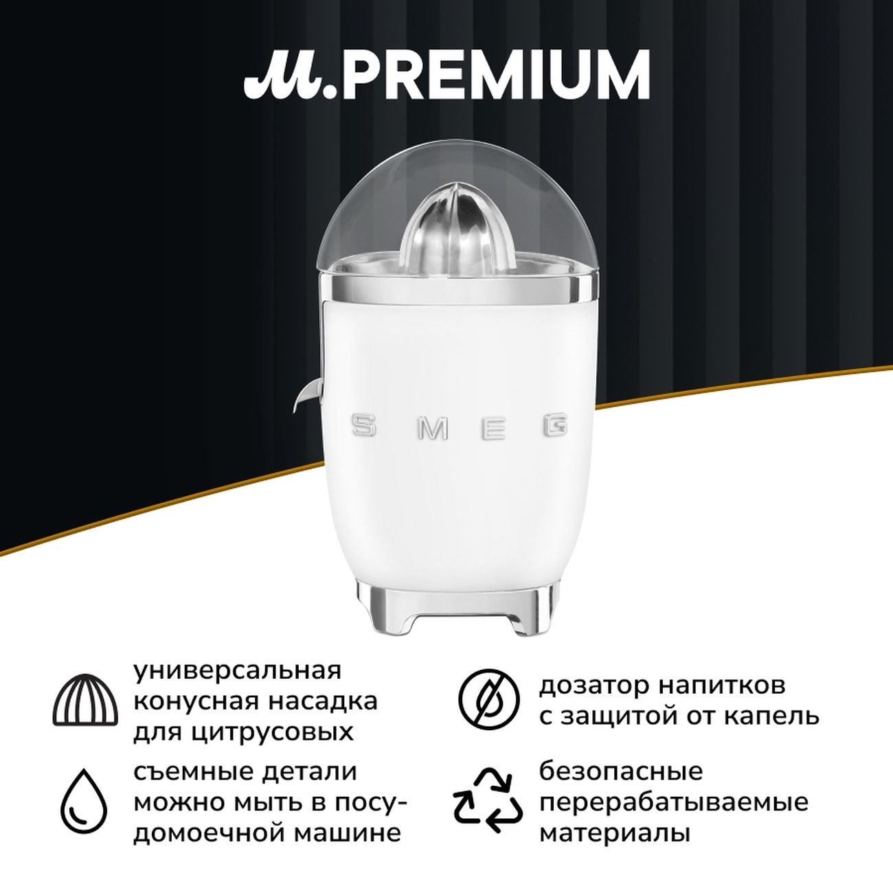 Вы можете купить Соковыжималка для цитрусовых Smeg CJF01WHMEU белая в магазинах М.Видео по доступной цене. Соковыжималка для цитрусовых Smeg CJF01WHMEU белая: подробное описание, фото и отзывы реальных покупателей, характеристики, возможность скачать инструкции и подобрать аксессуары.