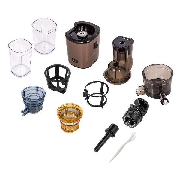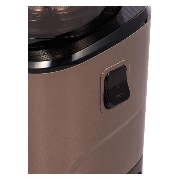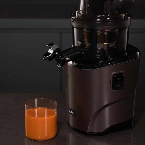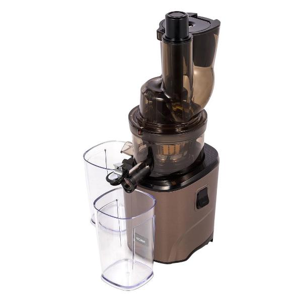 Шнековая соковыжималка Bork S710 в корпусе коричневого цвета оснащена загрузочным отверстием диаметром 8,8 см, что позволяет класть овощи и фрукты целиком. Объем резервуара для готового сока составляет 1 л. На нем располагается мерная шкала. Подача сока прямая.