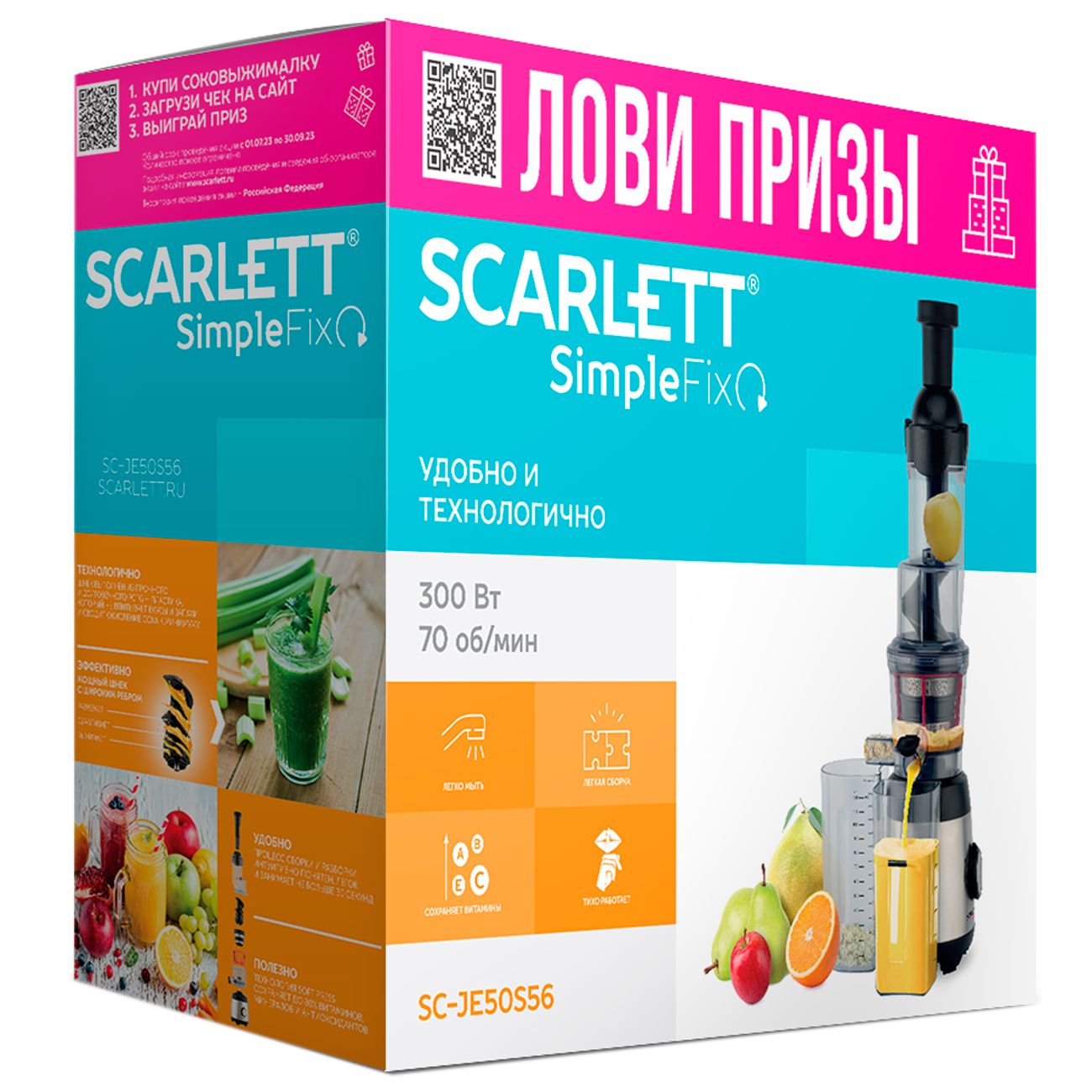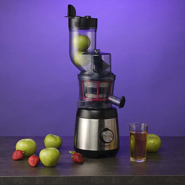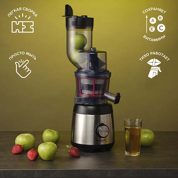 Scarlett SC-JE50S56 – соковыжималка шнекового типа, которая работает со скоростью 70 об/мин. Такой способ отжима позволяет избежать нагревания плодов и максимально возможно сохранить содержащиеся в них витамины. Эта модель – удачный выбор для тех, кто готовит сок в небольших объёмах каждый день.