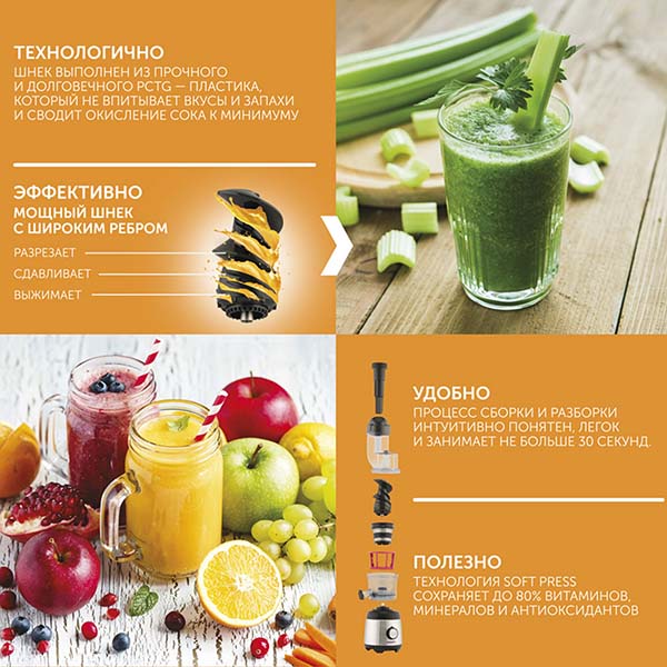 Ножки-присоски надёжно фиксируют соковыжималку и не дают ей скользить во время работы. Безопасность ваших рук обеспечивает толкатель. Корпус устройства выполнен из пластика и нержавеющей стали – прочных и долговечных материалов.