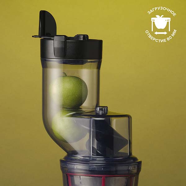 В комплект входят резервуары для сока (0,6 л) и мякоти (1,2 л) – вы сделаете сразу две-три порции. Ёмкости выполнены из качественного пластика, не мутнеющего от воздействия фруктовых кислот и не выделяющего вредных для здоровья веществ. Диаметр загрузочного отверстия 80 мм, что даст возможность не тратить время на предварительную нарезку плодов.