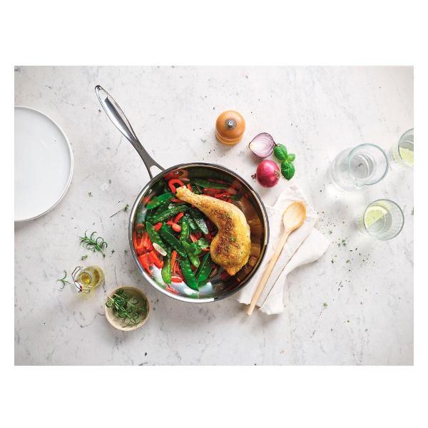 На внутреннюю стенку нанесено мерное деление для удобства. Изделие характеризуется универсальностью, что позволяет использовать его на всех типах варочных панелей. Сотейник этой модели подходит для мойки в посудомоечной машине.