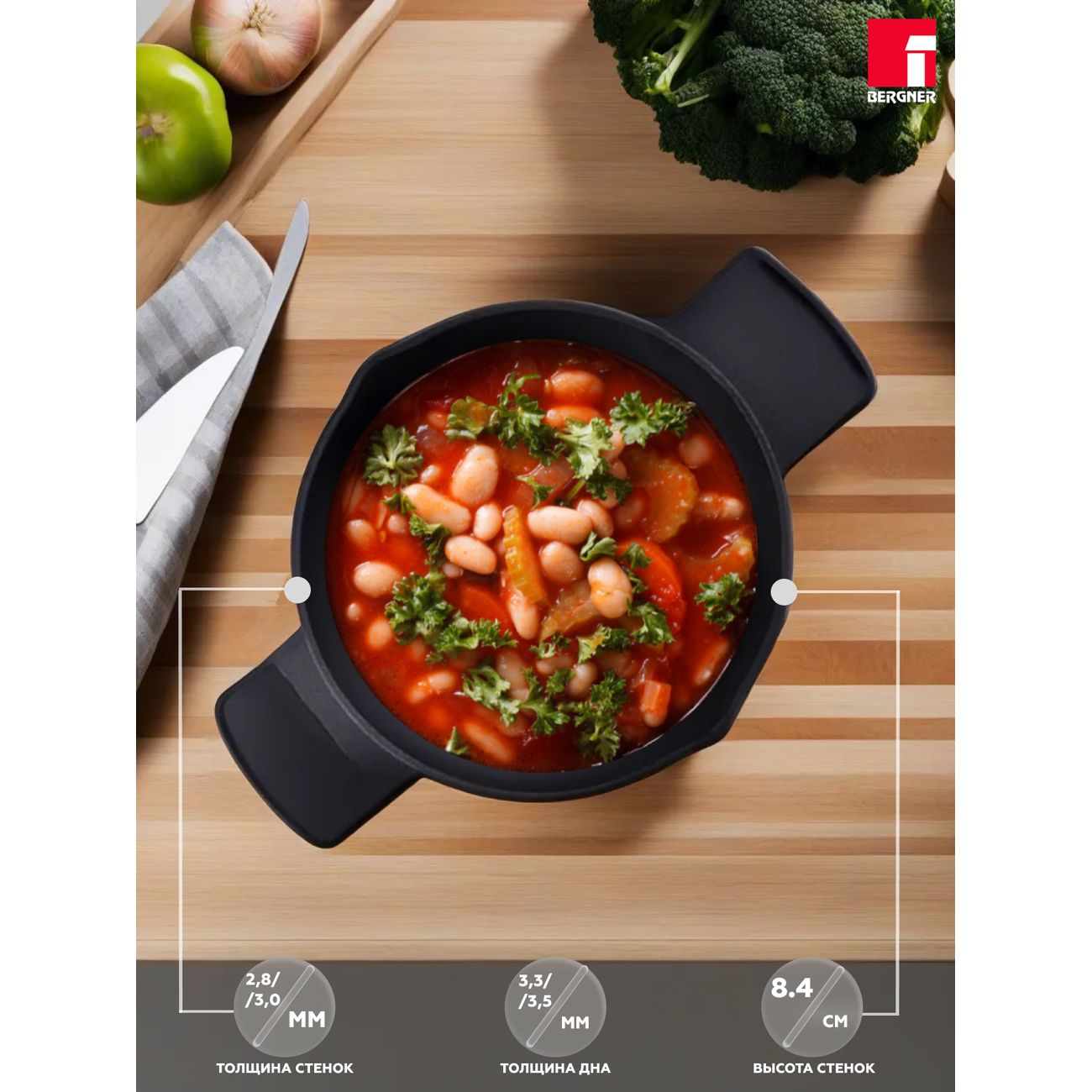 Сотейник Bergner BG-35913-BK обладает объемом 3,37 л, диаметром 28 см и высотой 17 см. Модель покрыта антипригарным составом для удобства использования и обладает обрезиненной ручкой для комфортного хвата. Корпус и дно сотейника изготовлены из алюминия, обеспечивающего равномерное распределение тепла при приготовлении. Ручка выполнена из пластика, устойчивого к высоким температурам.