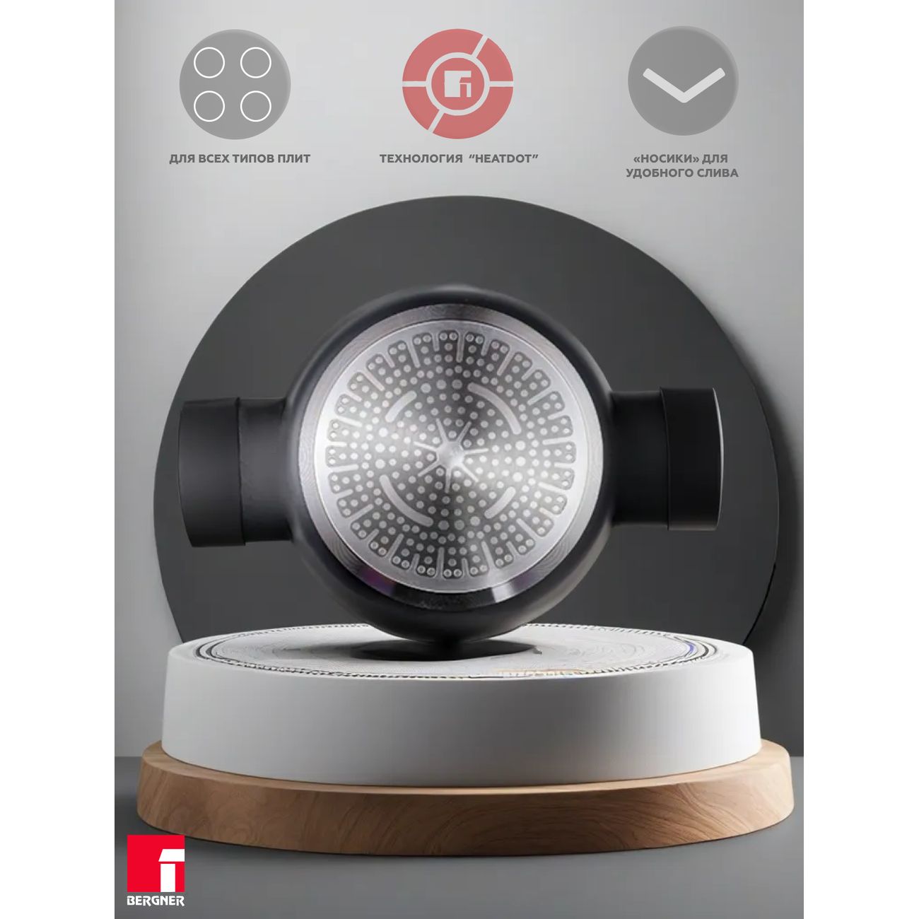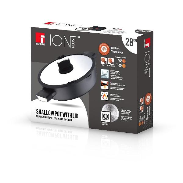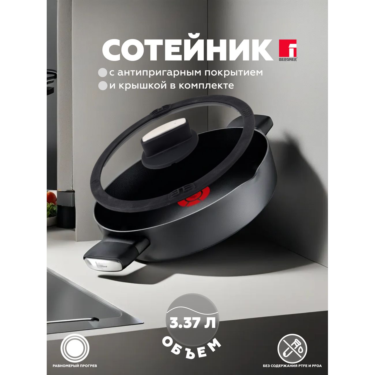 В комплекте поставляется крышка из стекла с выпускным клапаном, позволяющим контролировать пар и давление внутри. Сотейник совместим с различными источниками нагрева, включая индукционные конфорки.
