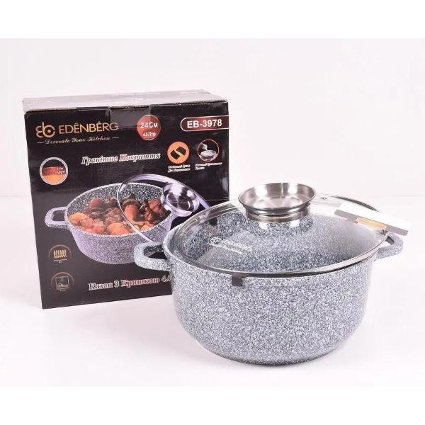 Сотейник Edenberg EB-3977 оборудован двумя небольшими ручками для переноски. В качестве материала корпуса использован прочный алюминий, устойчивый к механическим повреждениям и деформации. В рабочей области нанесено антипригарное покрытие. Диаметр посуды составляет 22 см. Модель отличается высокими стенками — 8 см. Возможно использование сотейника для приготовления блюд в духовке. Можно нагревать на всех видах плит. Разрешена ручная чистка и мойка в посудомоечной машине. Вес составляет 1,5 кг. В набор входит стеклянная крышка.
