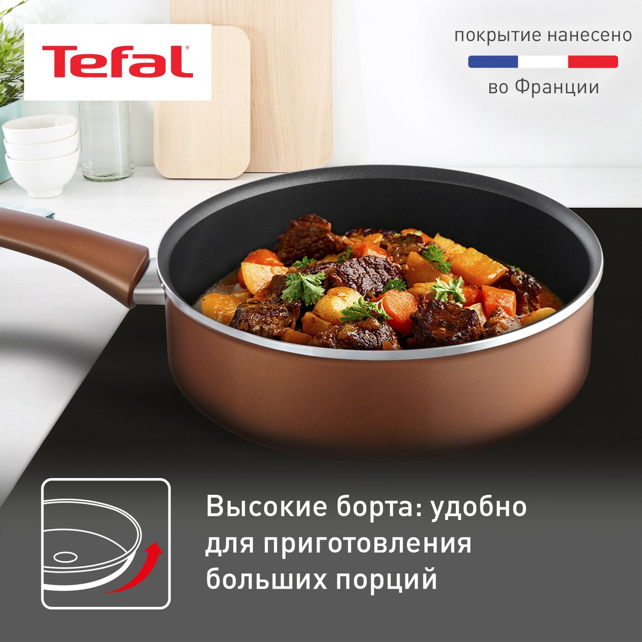 Замечательный сотейник, его цвет сразу привлекает внимание, размер очень удобный -24 см, дно толстое, достаточно тяжелый, хорошо держит тепло, поэтому содержимое как бы томится. Благодаря антипригарному покрытию пища не пригорает, не прилипает, масло можно использовать совсем немного.. Он универсален, в нем можно и жарить, и тушить, бортики высокие, поэтому брызги не попадают на варочную поверхность. Ручка пластиковая, не нагревается, и в комплекте идет крышка тоже с такой ручкой. Моется легко, просто губкой с моющим средством.