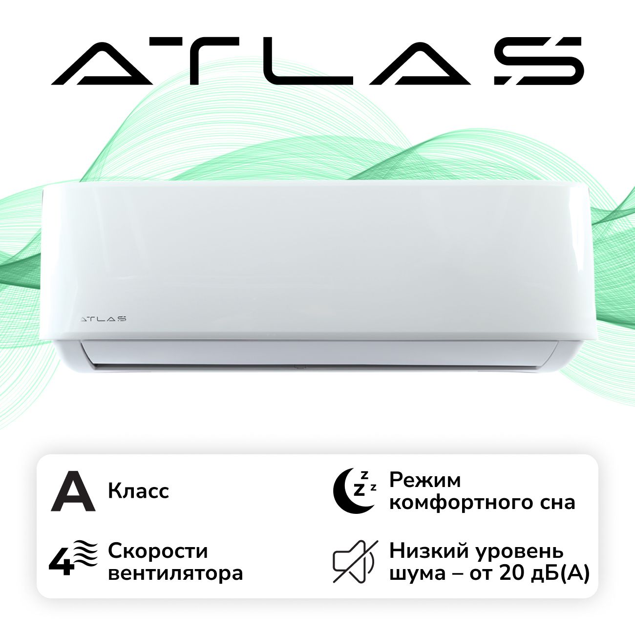Сплит-система Atlas AT-12B/ODU бело-серебристого цвета управляется с помощью пульта. Присутствует функция автоматического размораживания наружного блока. Изделие рекомендуется применять в помещении площадью до 30 м². Шум внутри помещения не превышает 25 дБ, что позволяет использовать модель даже ночью. Мощность — 1,114 кВт. Габариты внешнего блока — 42х68х27,5 см, вес — 25 кг. На цифровом дисплее отображается выбранный режим и температура. Вентилятор оснащен четырьмя скоростями. Дисплей можно отключить.