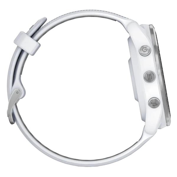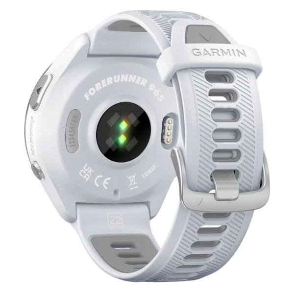 Спортивные часы Garmin Forerunner 965 белого цвета с силиконовым гибким ремешком, рассчитаны на обхват запястья в пределах 120–190 см и регулируются по руке.