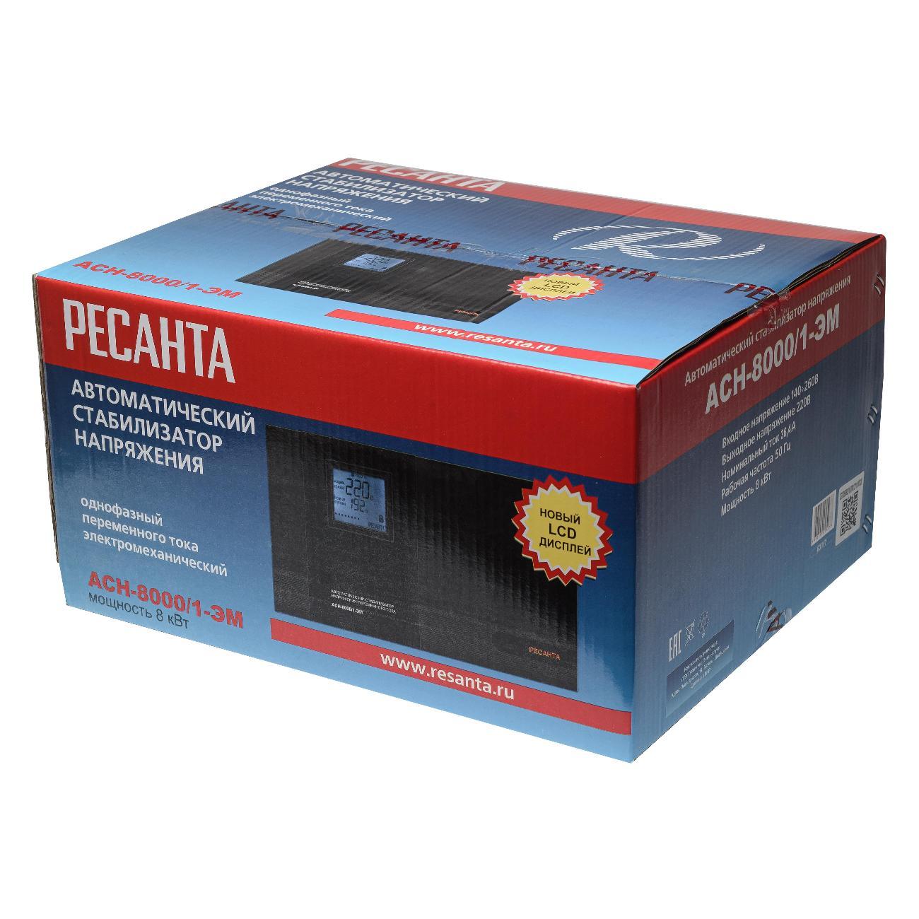 Стабилизатор напряжения «Ресанта» АСН-8000/1-ЭМ оснащен встроенными фильтрами, считывающими частотные помехи. Устройство применяется для защиты приборов от перепадов в сети переменного тока. Эксплуатация ведется температуре от -5°C до 40°C. Тип установки — напольный.