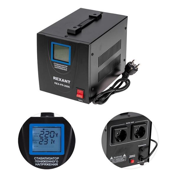 Стабилизатор напряжения Rexant REX-FR-2000 с максимальной нагрузкой по мощности 2000 Вт и предельным током 9 А. Диапазон стабилизации составляет 100-260 В. Минимальное входное напряжение достигает показателя 100 В, выходное — 220 В. Конфигурацией модели предусмотрено наличие двух защищенных розеток с возможностью использования вилок евростандарта, заземляющего контакта и сетевого шнура длиной 1,2 м.