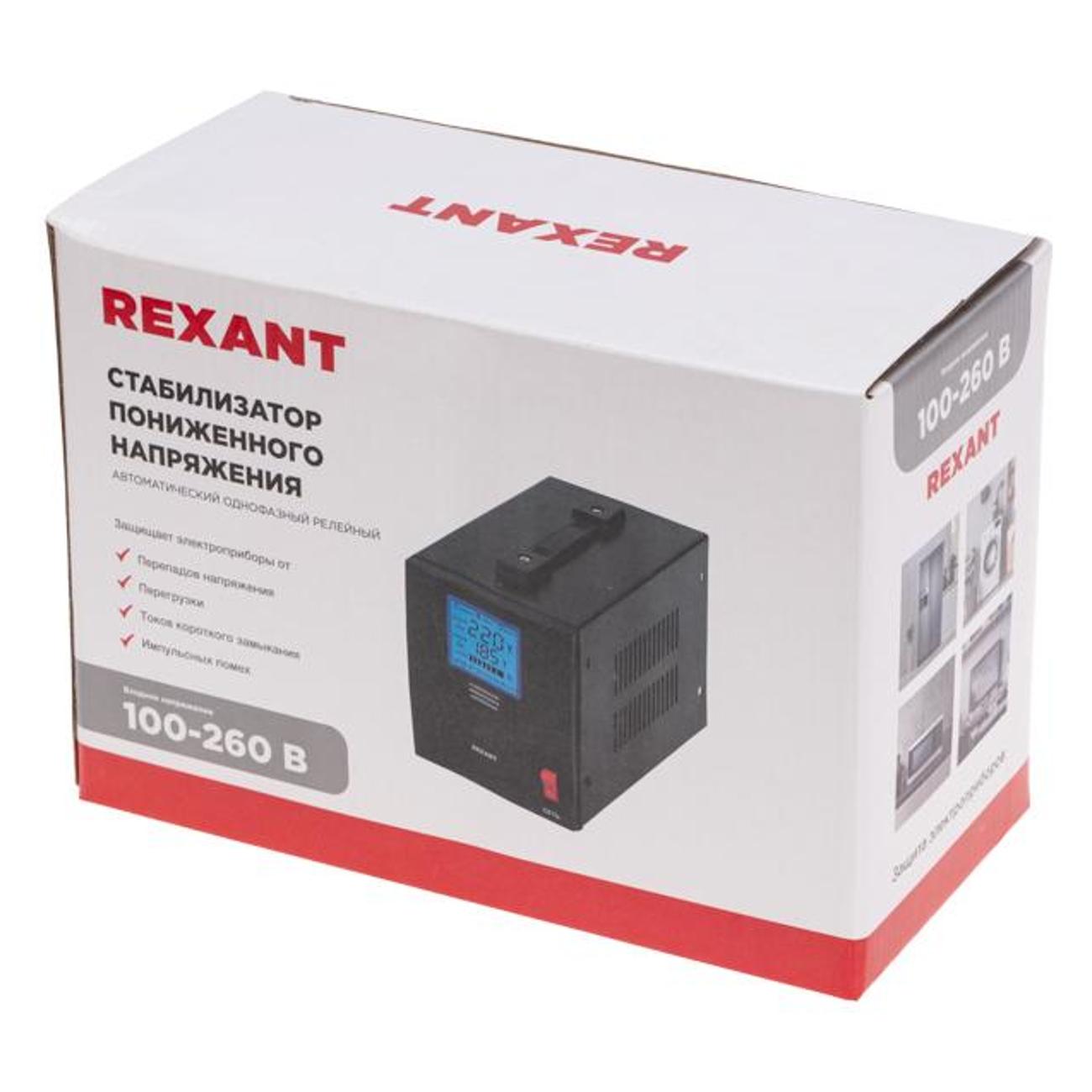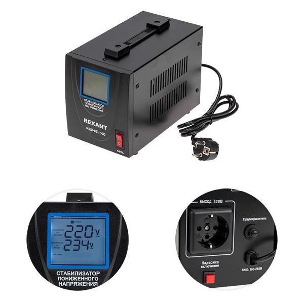 Стабилизатор напряжения Rexant REX-FR-500 с максимальной нагрузкой по мощности 500 Вт и предельным током 2,3 А. Диапазон стабилизации составляет 100-260 В. Минимальное входное напряжение достигает показателя 100 В, выходное — 220 В. Конфигурацией модели предусмотрено наличие защищенной розетки с возможностью использования вилки евростандарта, заземляющего контакта и сетевого шнура длиной 1,2 м.